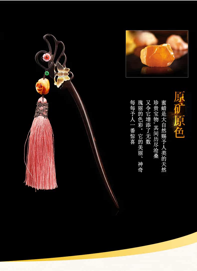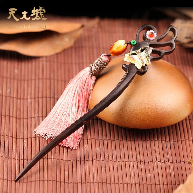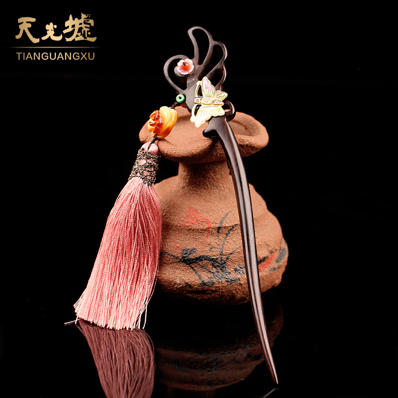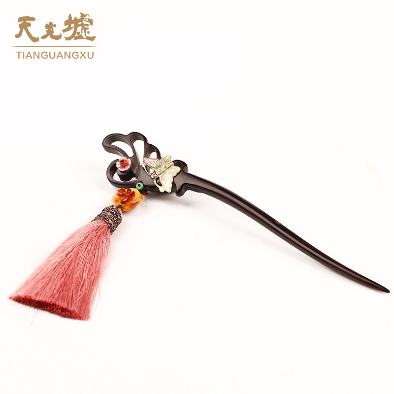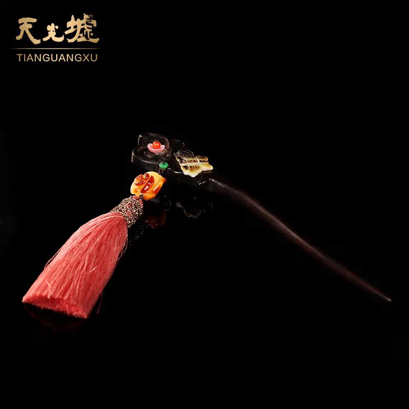 天光墟 Янтарная классическая китайская шпилька из воскового агата, ретро аксессуар для волос, заколка для волос из черного дерева Эбен из сандалового дерева, шпильки для волос с кисточками