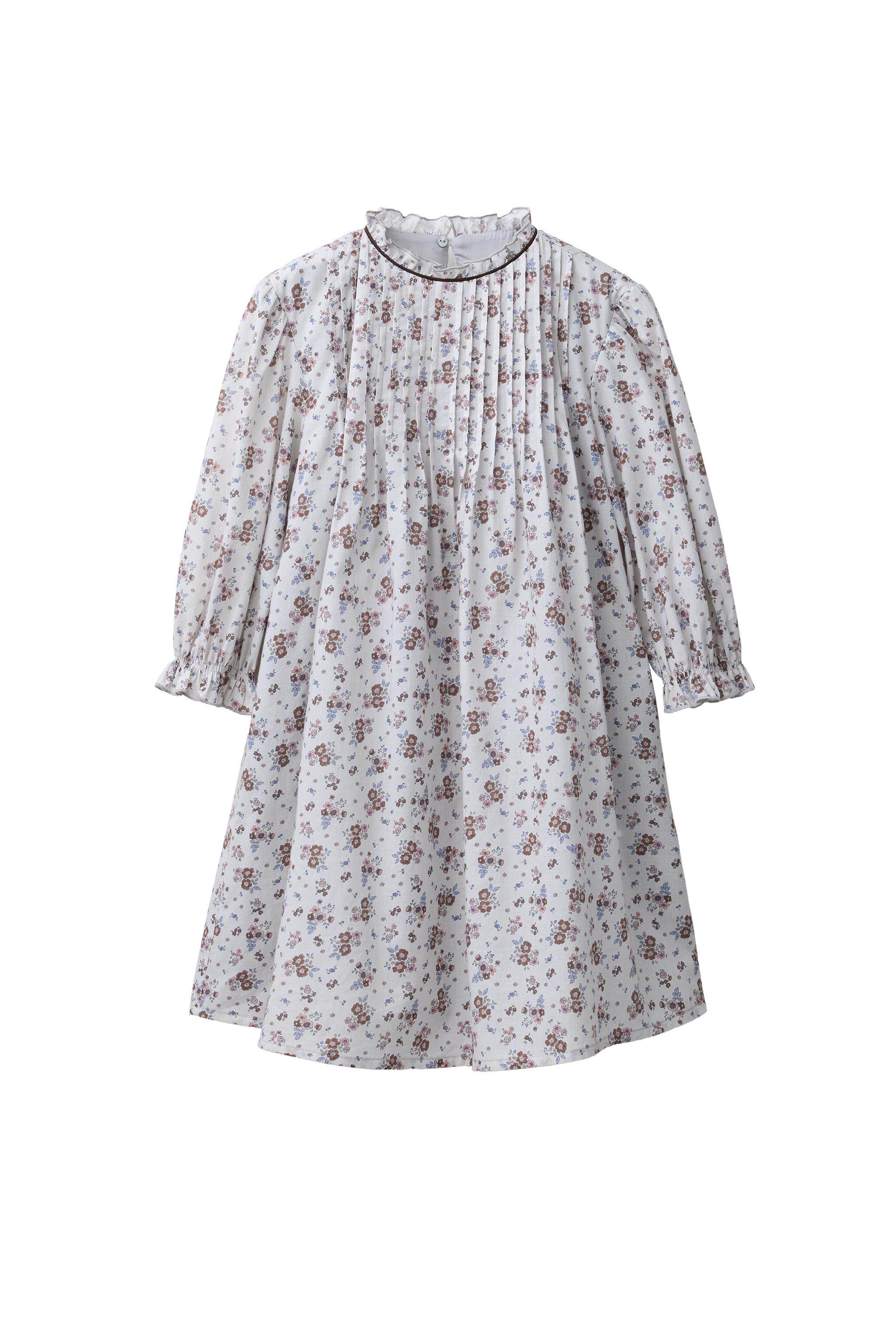 Платье с длинными рукавами, высоким воротником и эластичными манжетами.Отделка рюшами спереди, разрез сзади, застежка на пуговицы.Цветочный принт.
