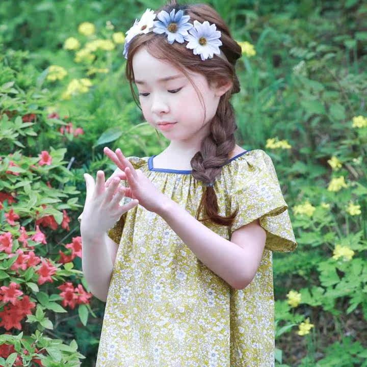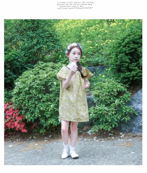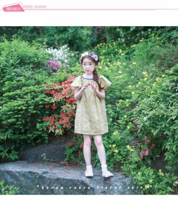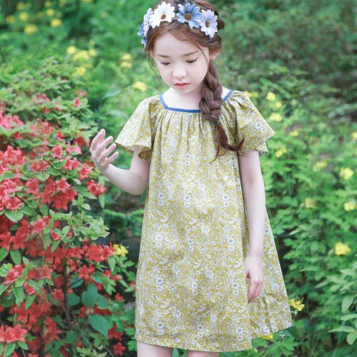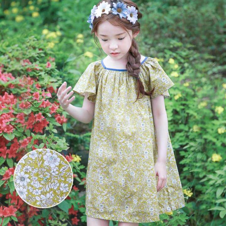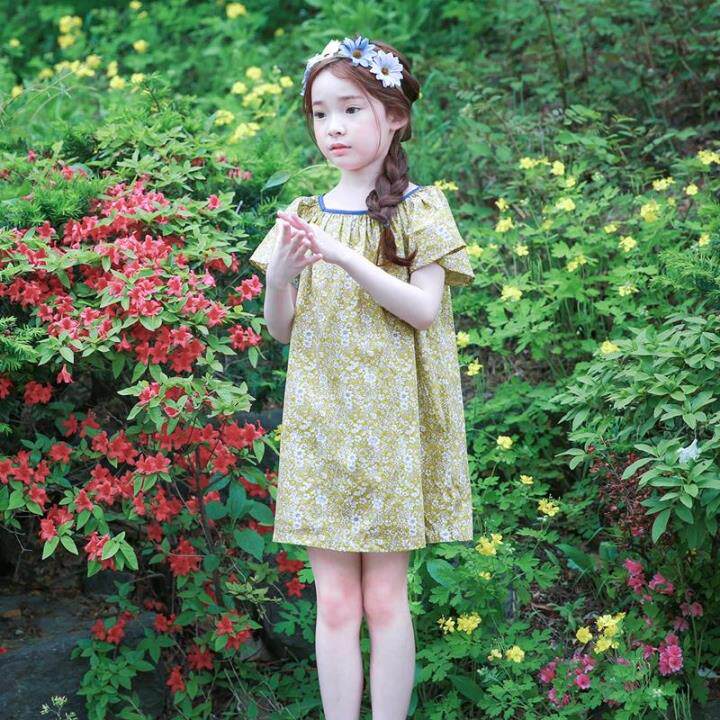 Желтое летнее платье, пляжная юбка на девочку, короткий рукав, А-силуэт, детская одежда, в корейском стиле, в цветочек