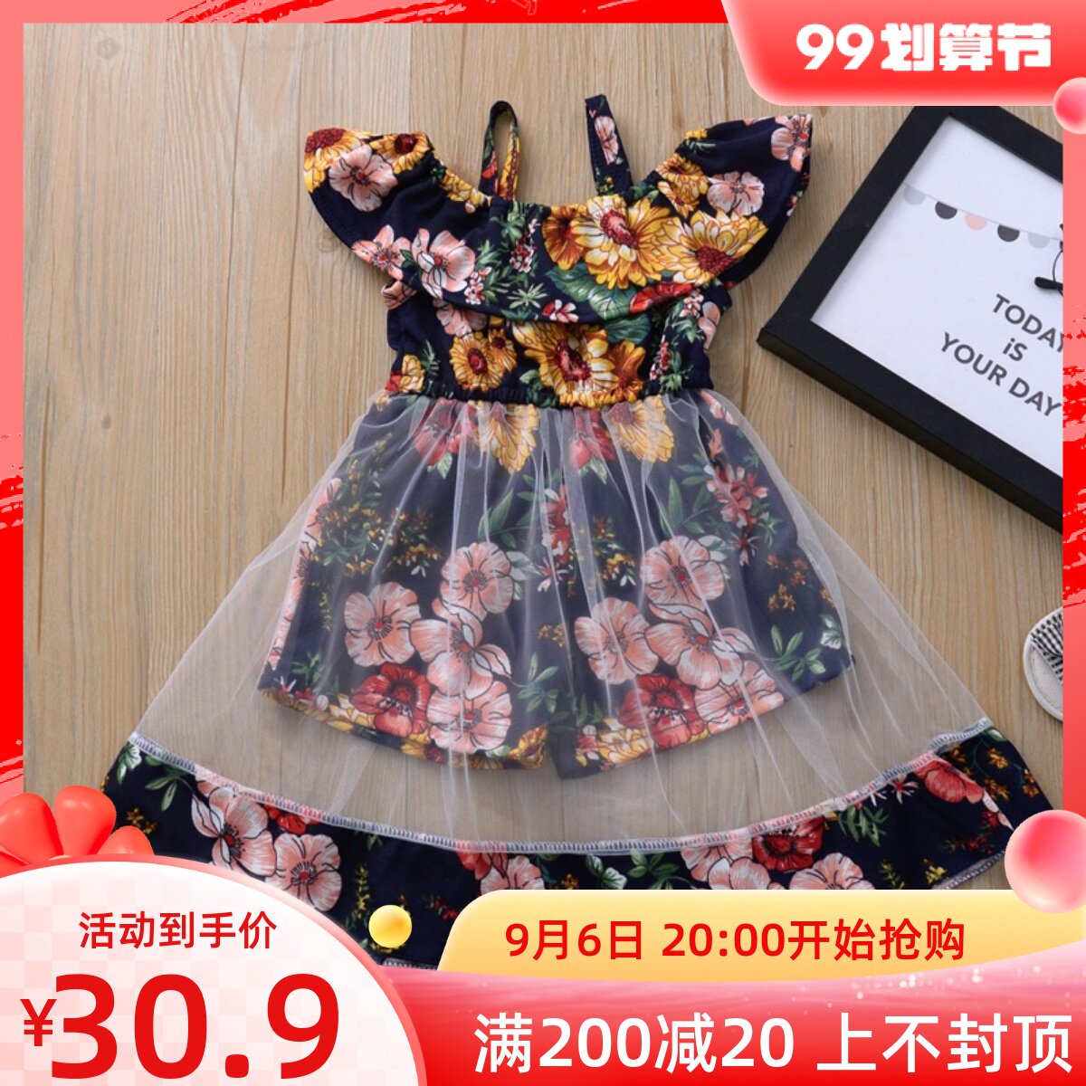 (Трансграничная торговля), брендовое платье для девочек, европейский стиль, эффект подтяжки, цветочный принт, юбка из сетки