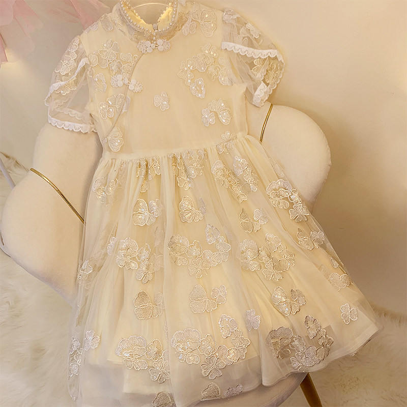 Детская летняя юбка, кружевное ципао, наряд маленькой принцессы, платье, мини-юбка, китайский стиль, короткий рукав