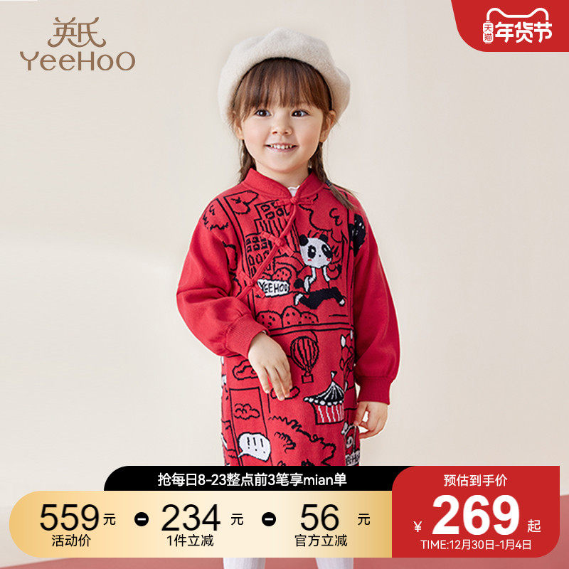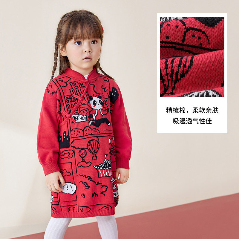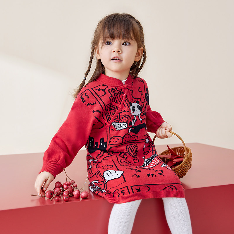Детское осеннее трикотажное платье, юбка, лонгслив, демисезонное красное ципао для девочек