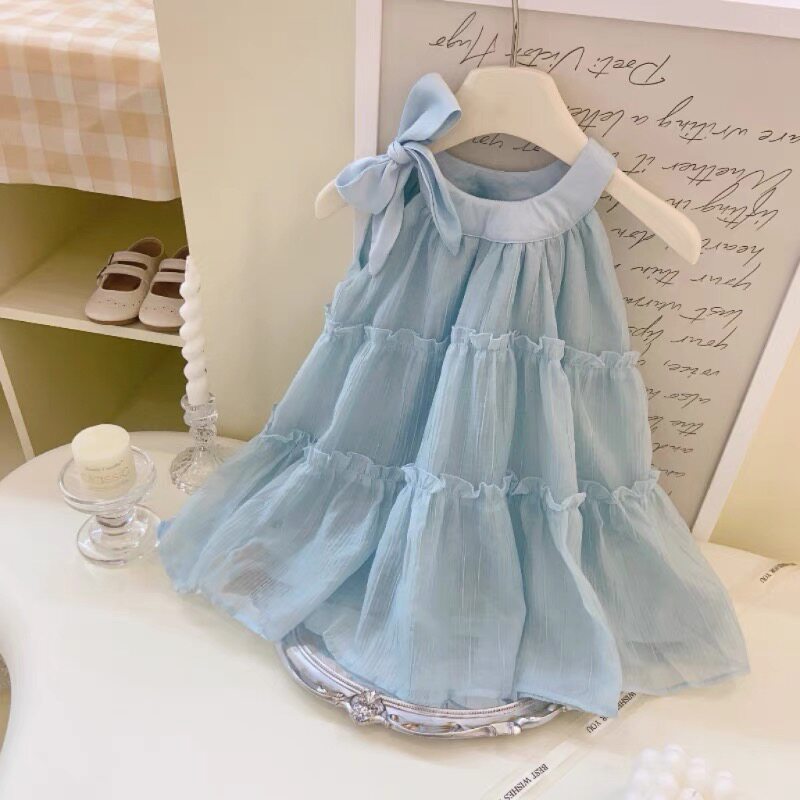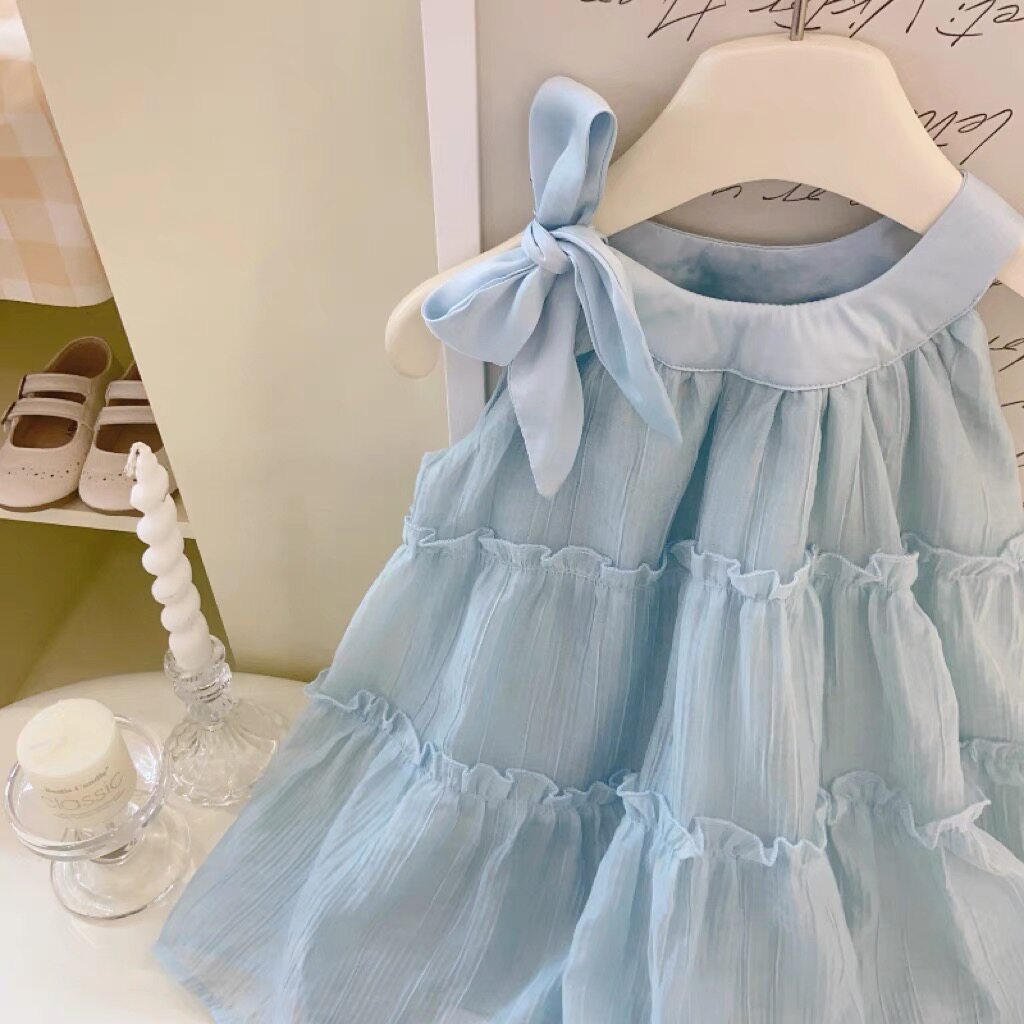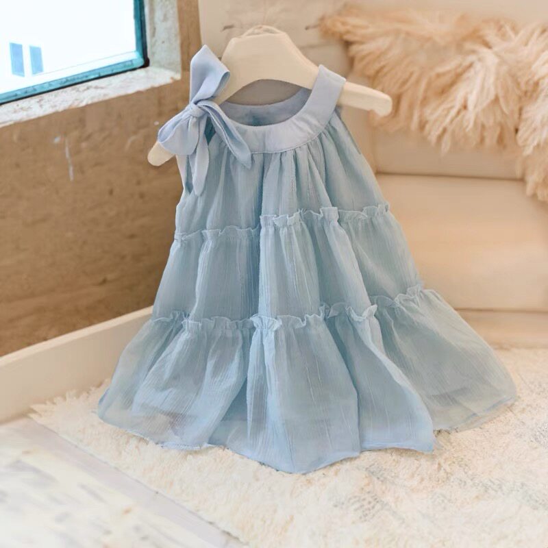 Летнее синее милое платье-комбинация, наряд маленькой принцессы без рукавов, стиль
