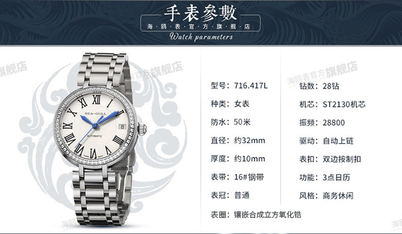 Таблица Seagull 716.417L Римская цифровая цифровая диаграмма алмазной машины Автоматическая машина мода Женская Женская Женская Женская Страхование часов