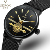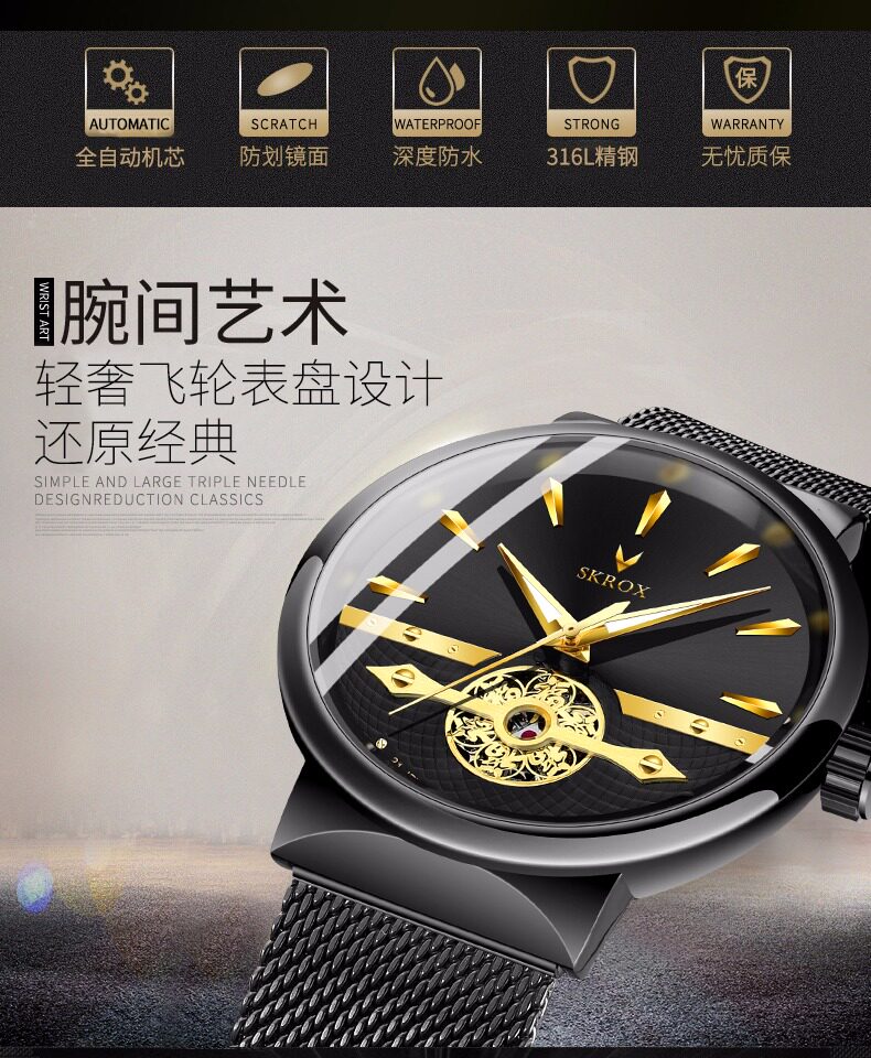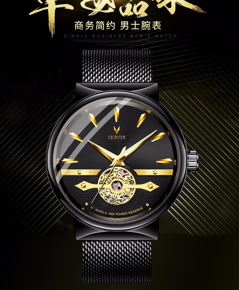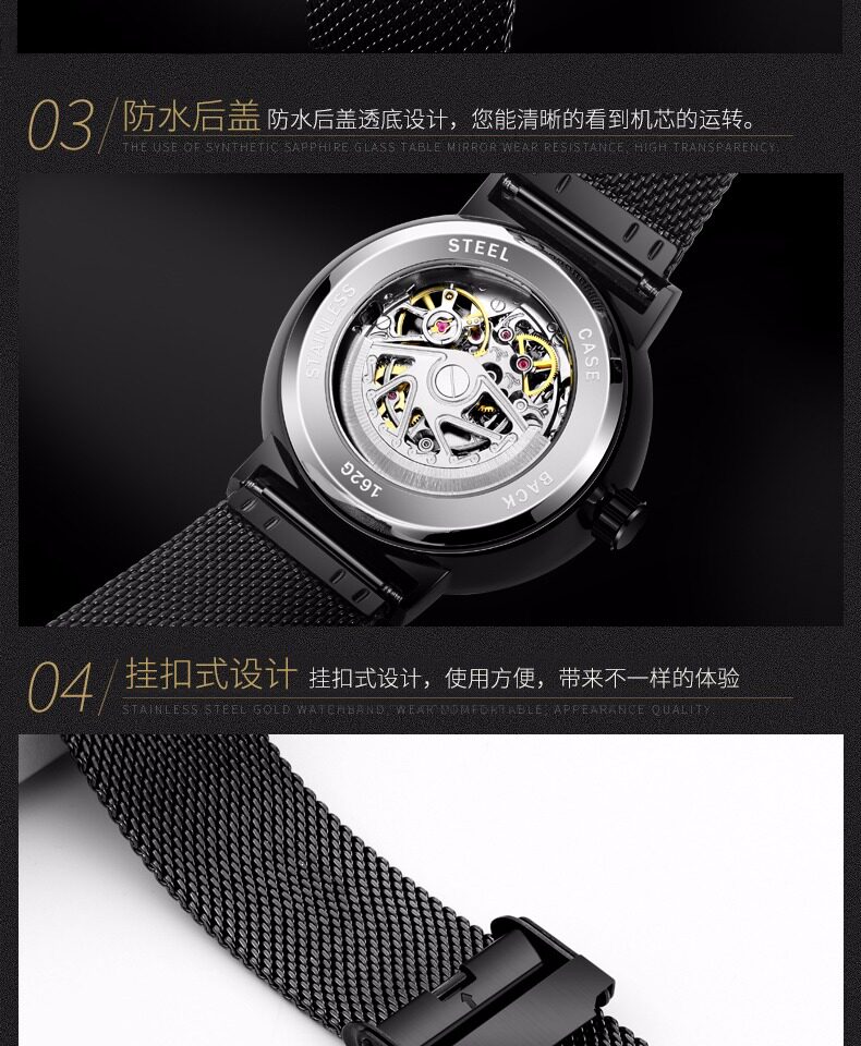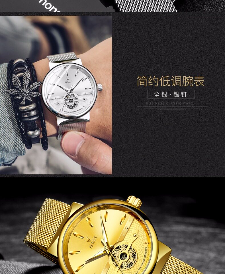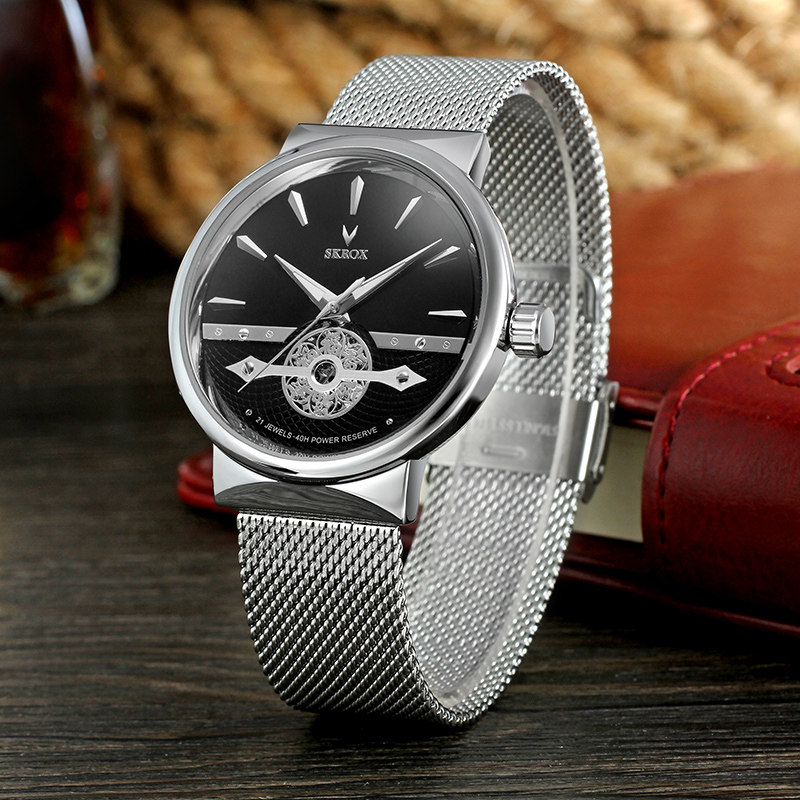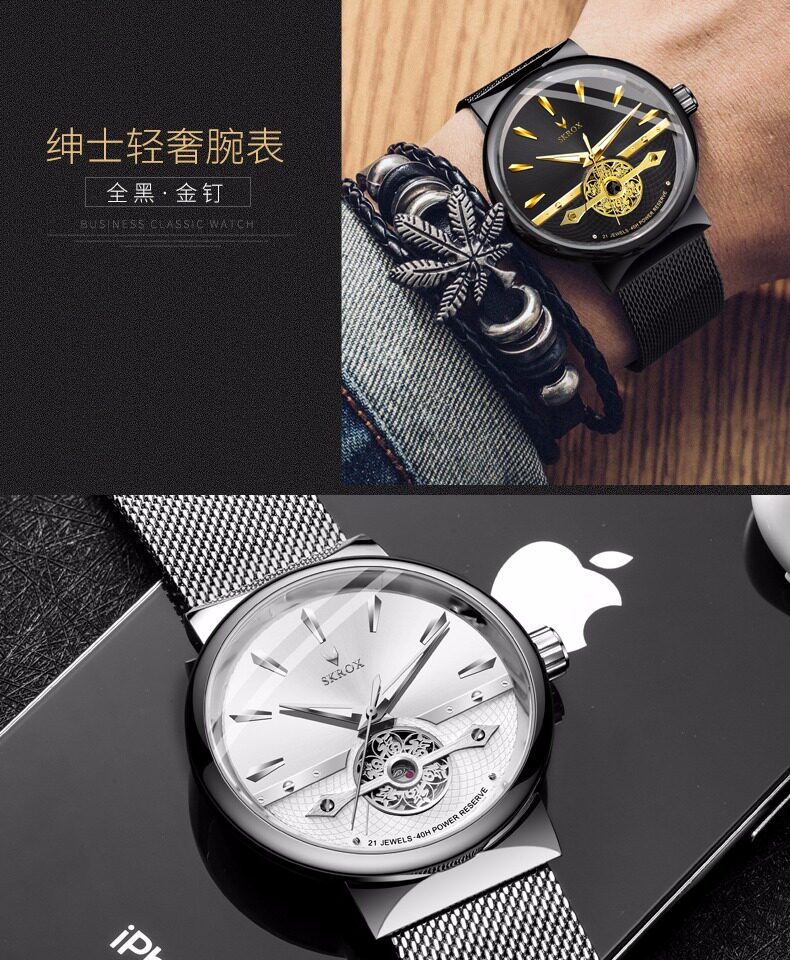 Мужские часы, тонкий водонепроницаемый стальной ремешок, модные механические механические часы, из натуральной кожи, полностью автоматический