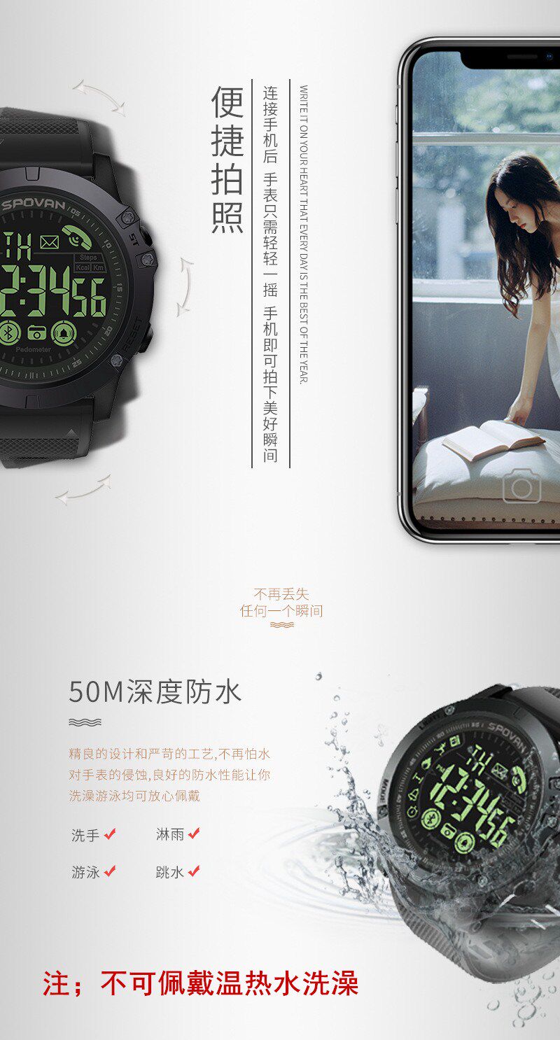 Удаленная камера-Кнопка затвора камеры мобильного телефона распространяется на часы, а часы в пределах 10 метров могут управлять дистанционным управлением.