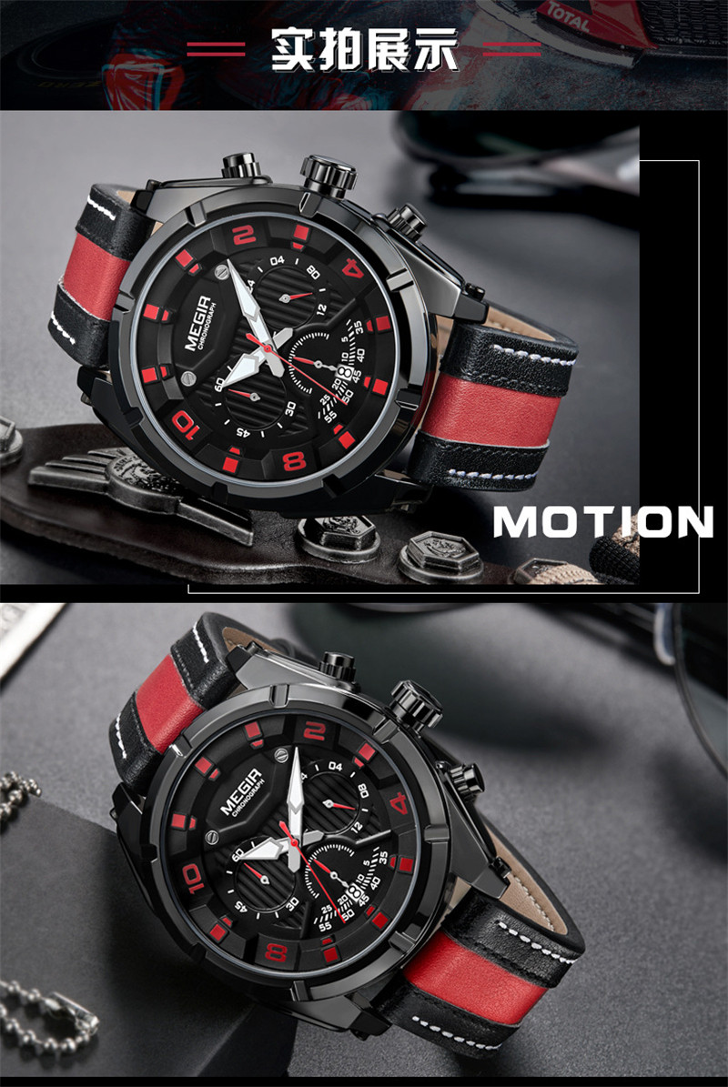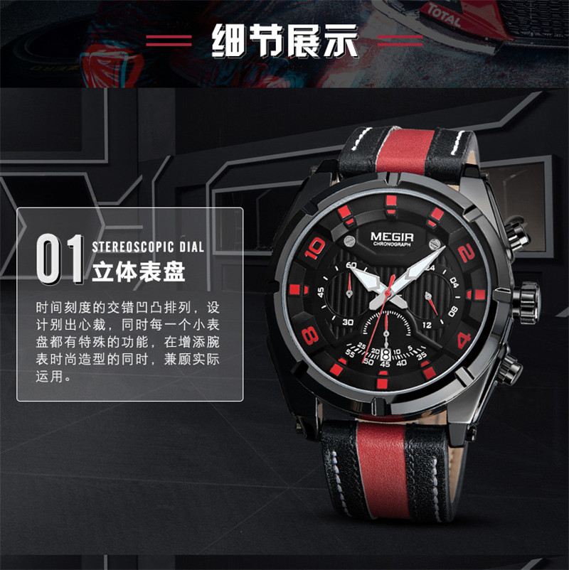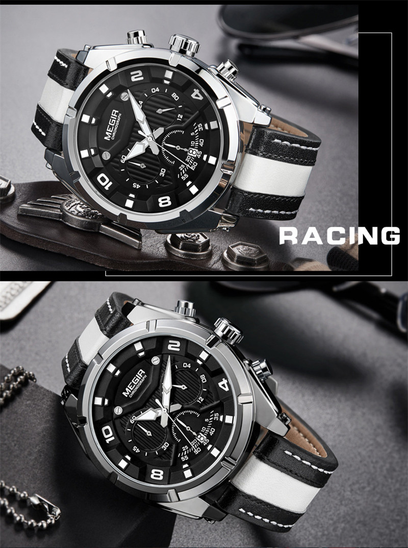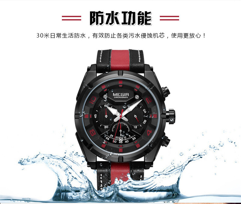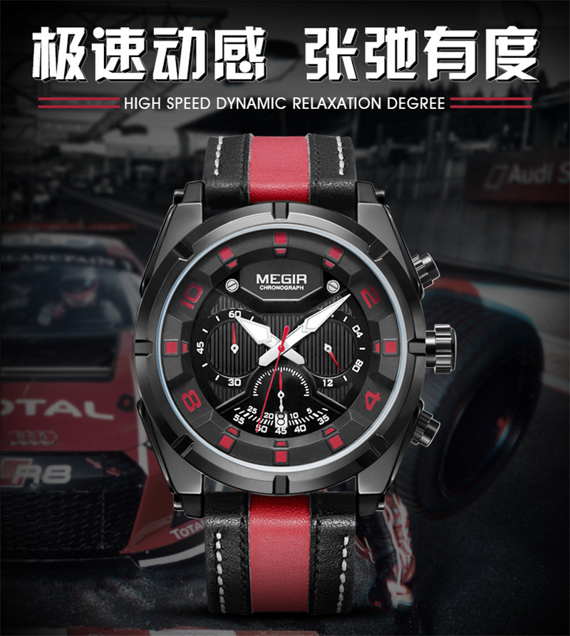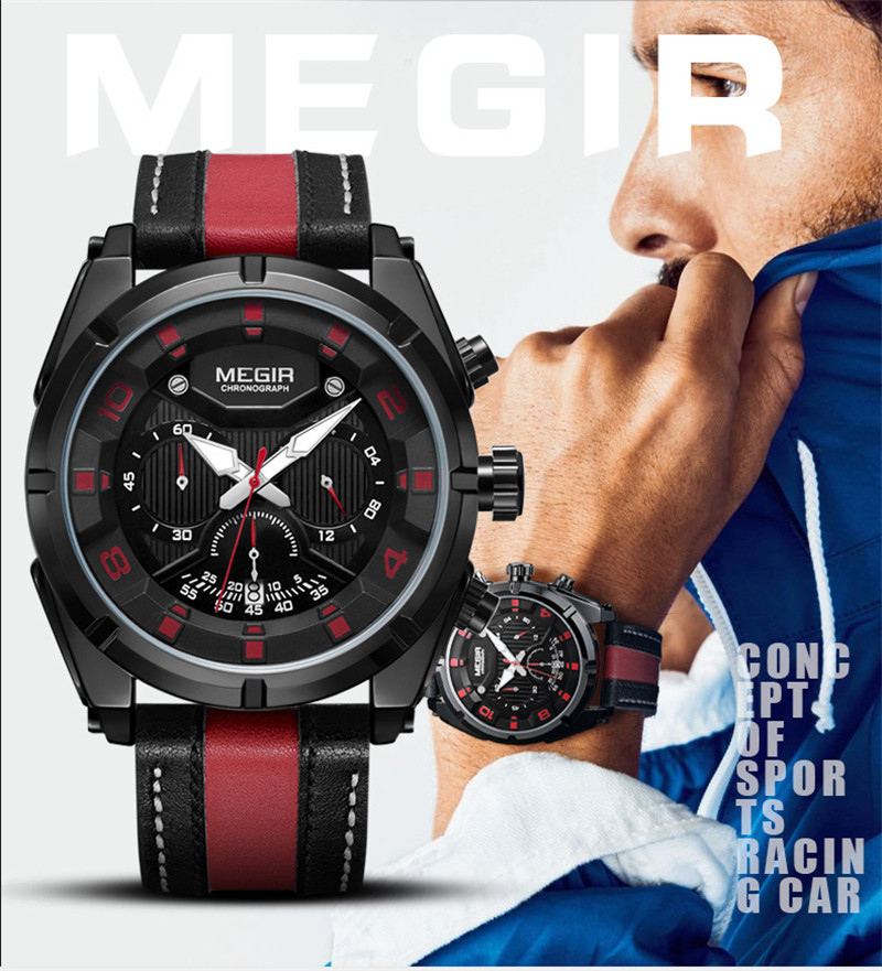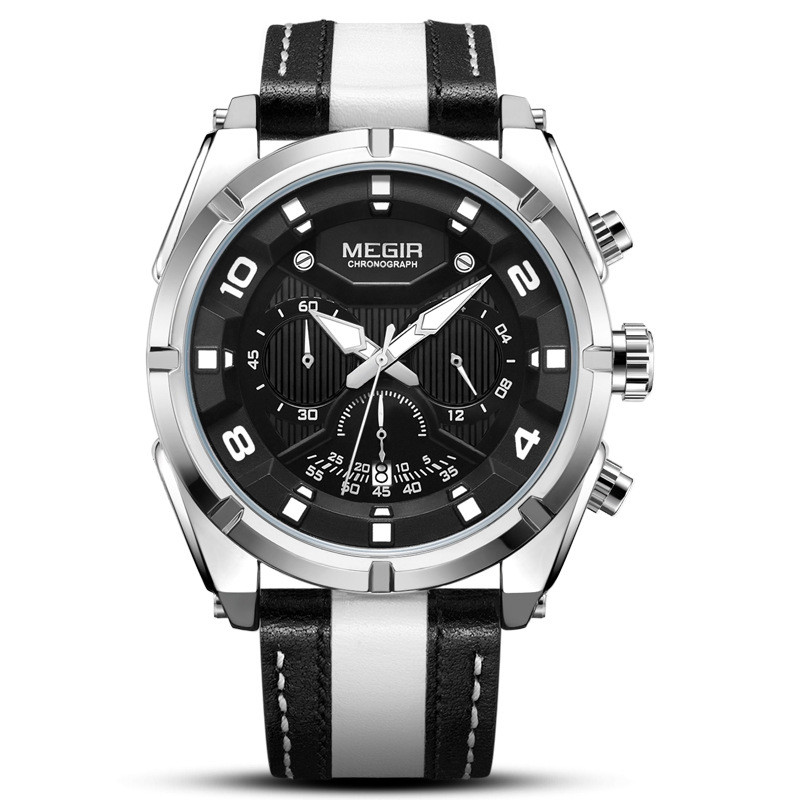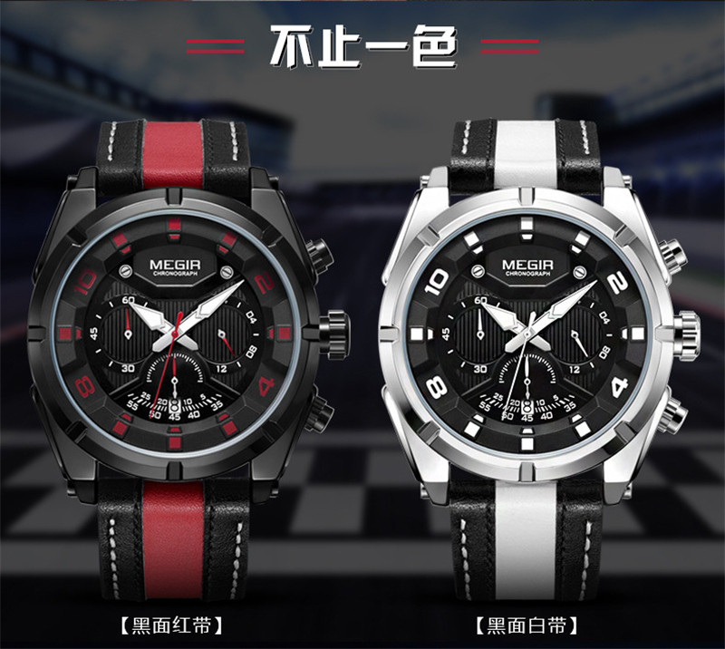 Megir Fashion European и American Retrocating Male Watchs Personality Broad Market Sports Watch Three -Eye Running Second Leather 2076