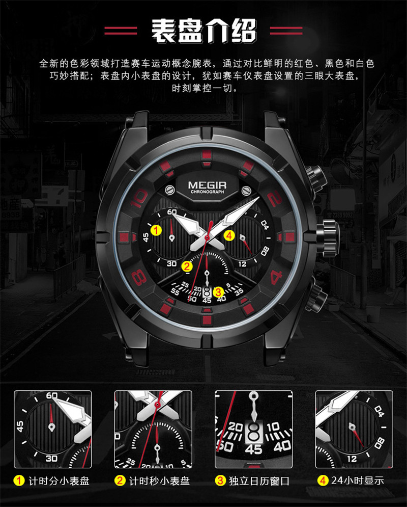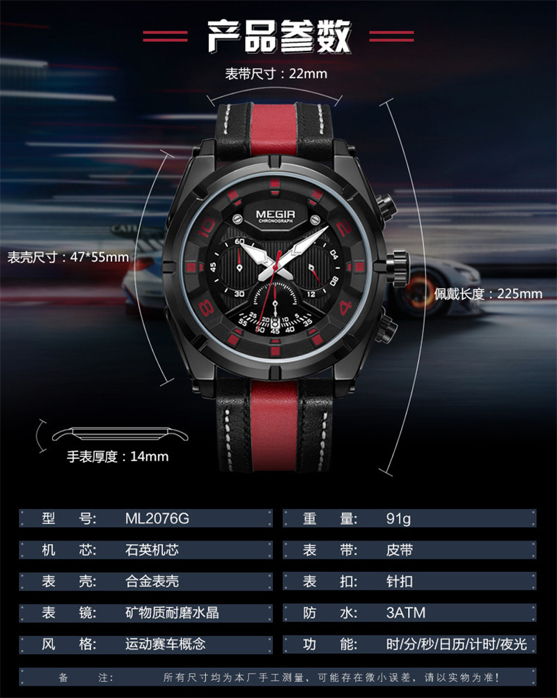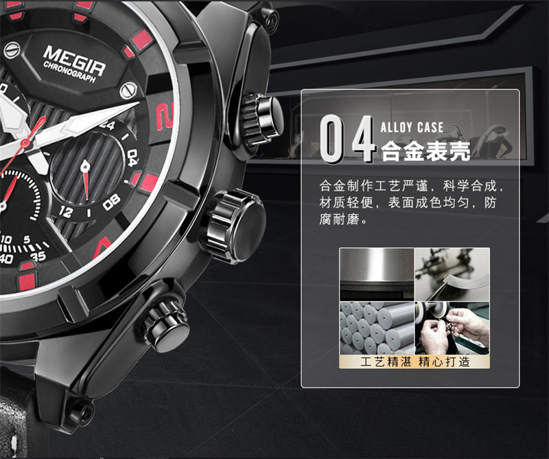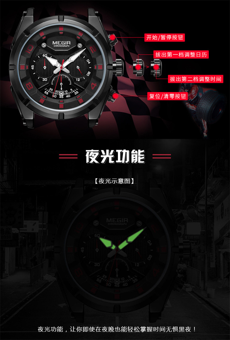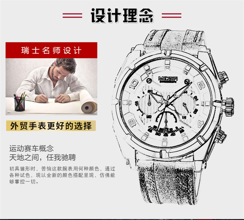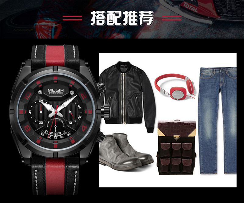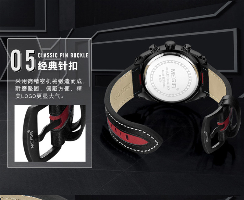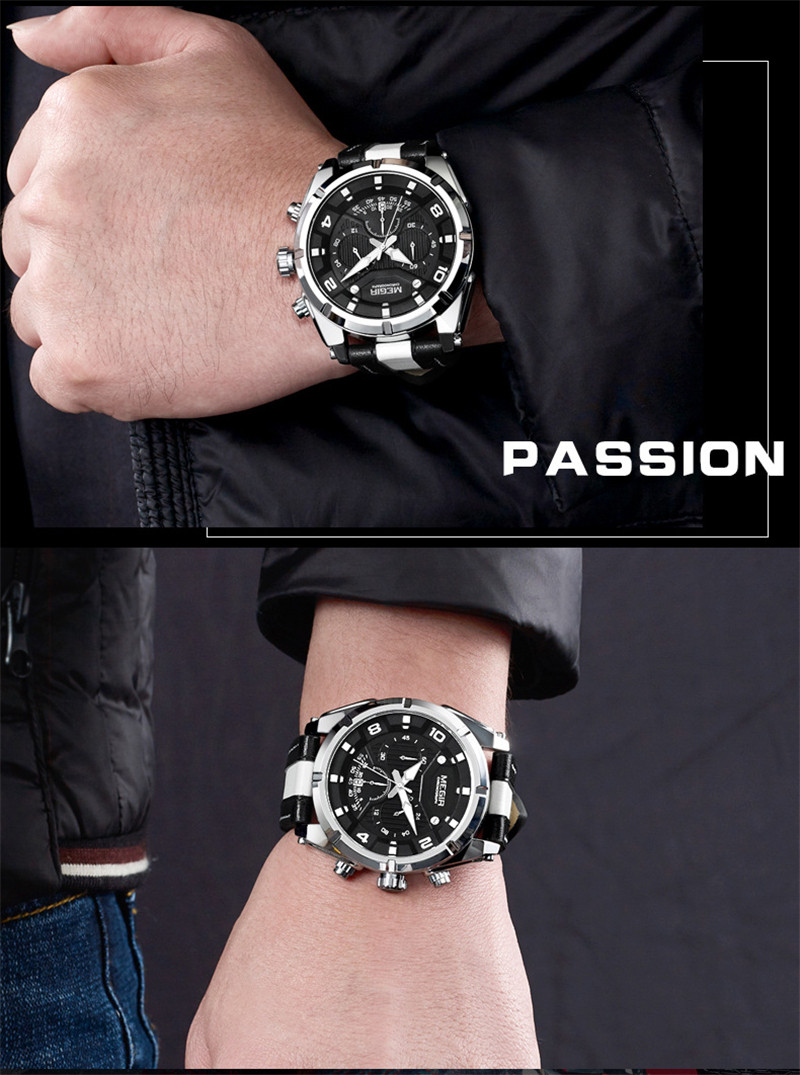 Megir Fashion European и American Retrocating Male Watchs Personality Broad Market Sports Watch Three -Eye Running Second Leather 2076