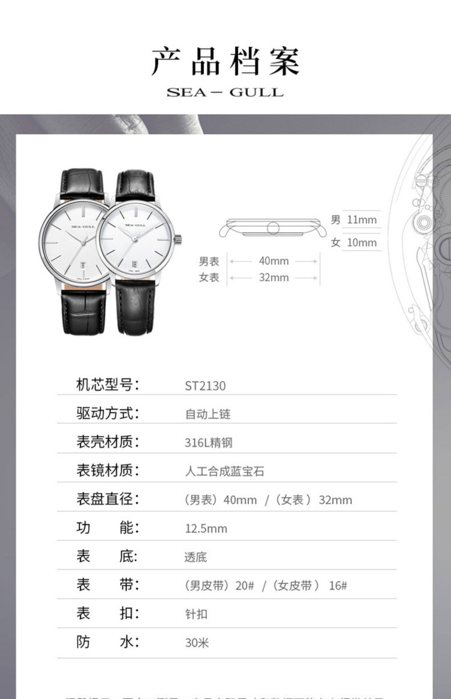Seagull Seagull Pare Watch Simple Business Belt Men's Women's Women Automatic Mechanical Watch 6021 National Series