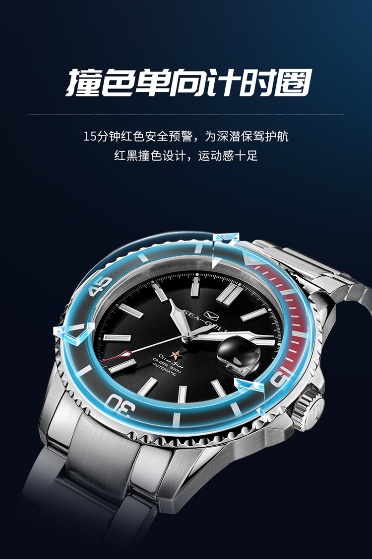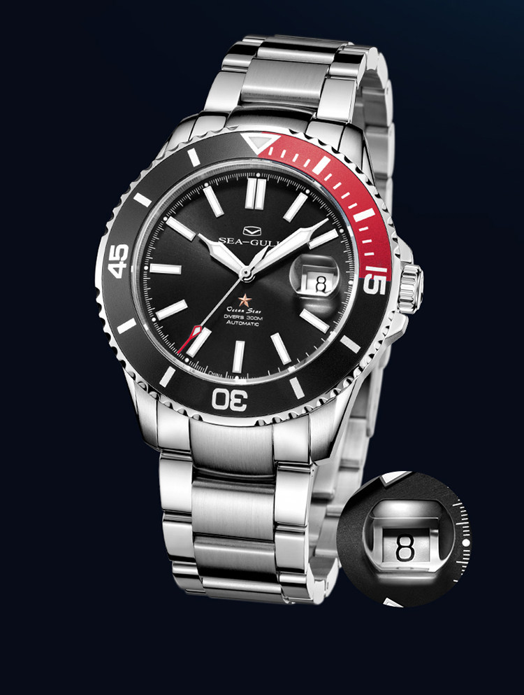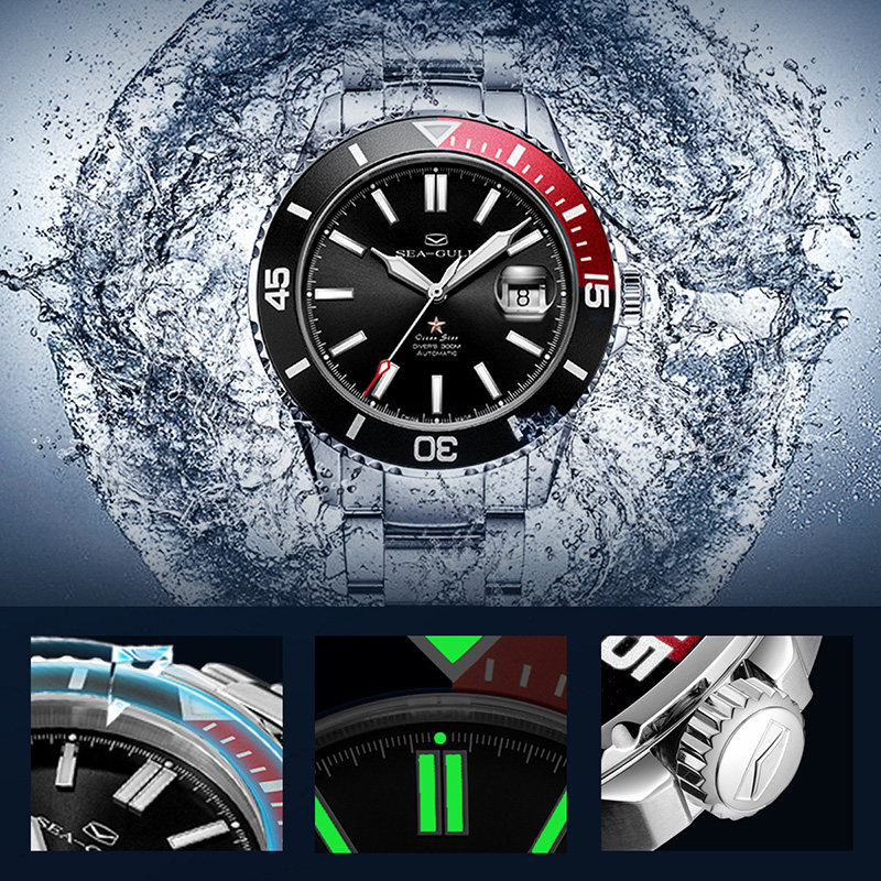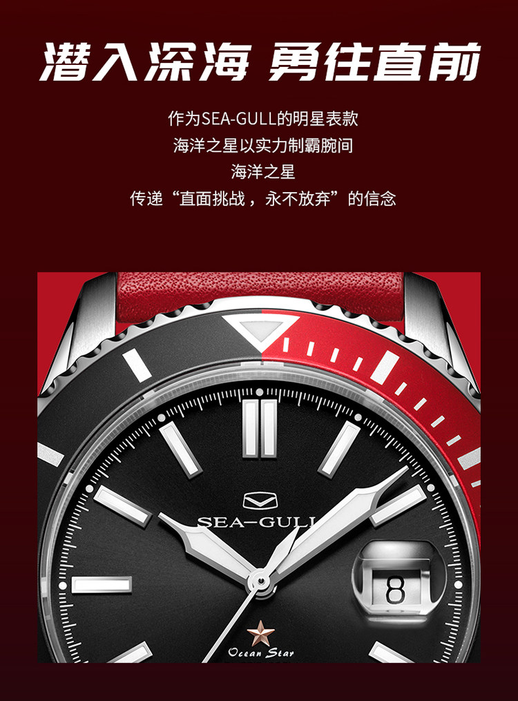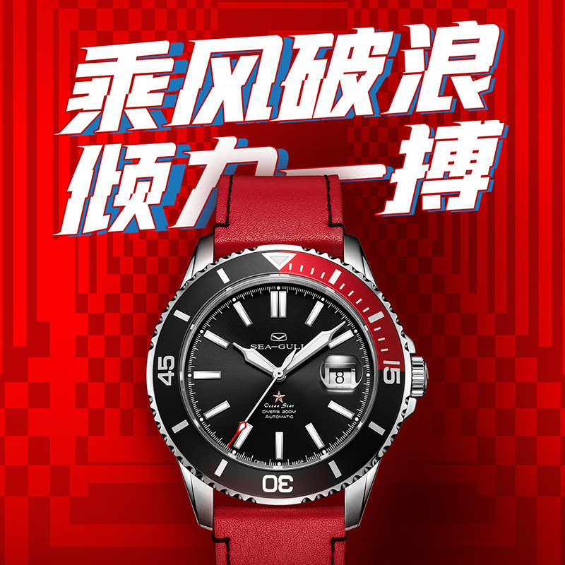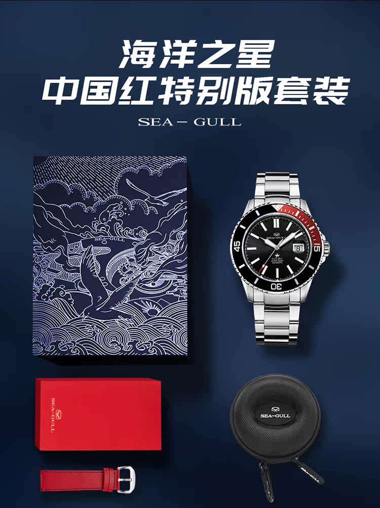 [Lang Ping той же модель] Seagull Watch Diving Business Steel Belt Automatic Mechanical Men's Watch 6114 Marine Star China Red