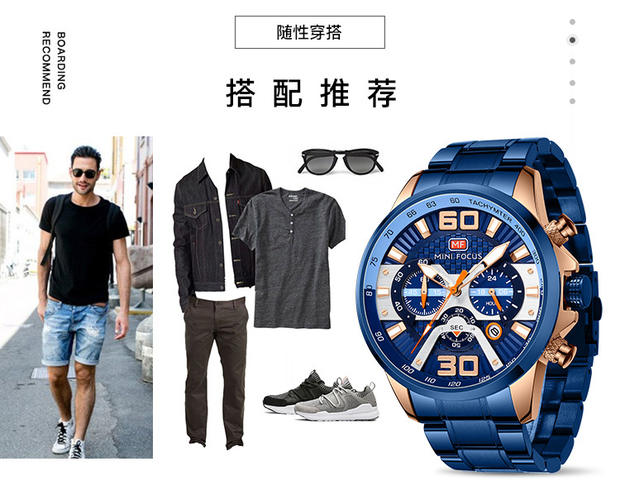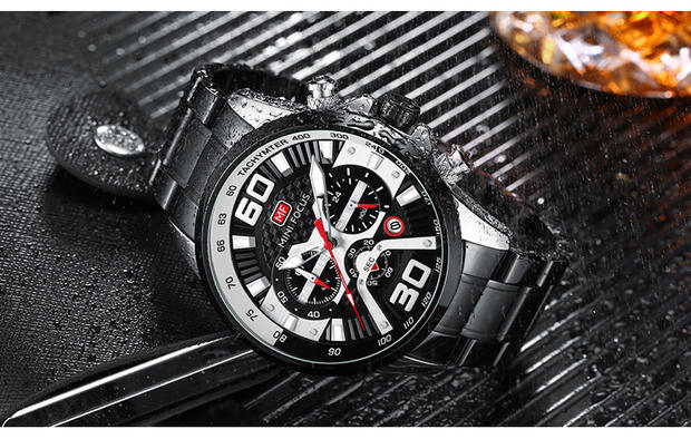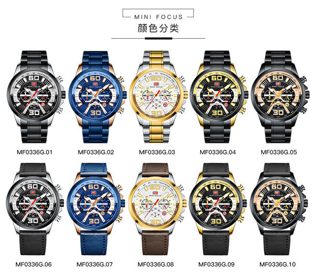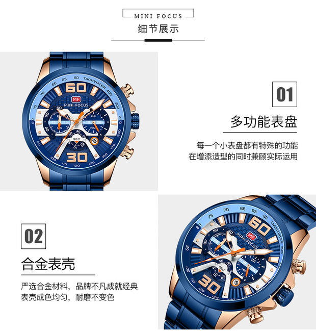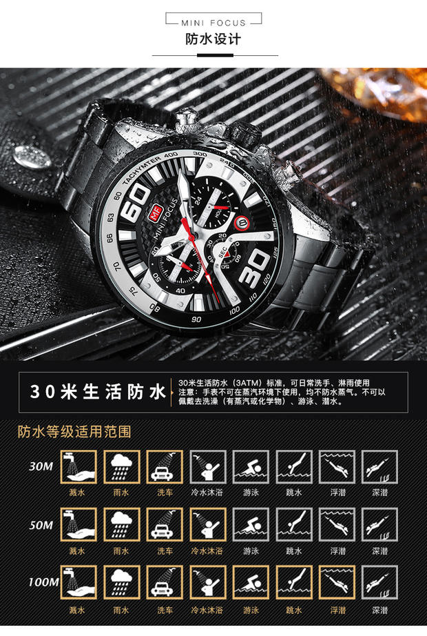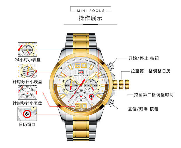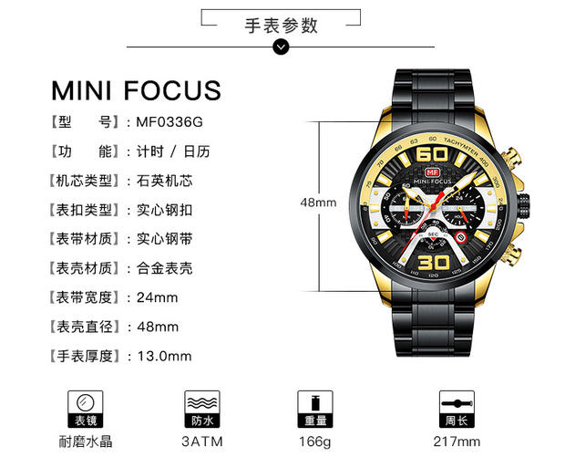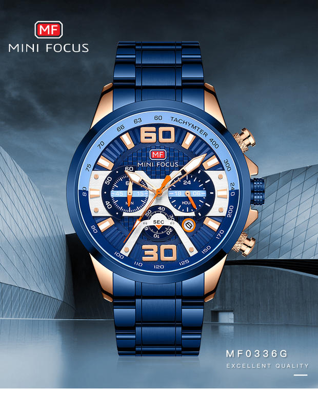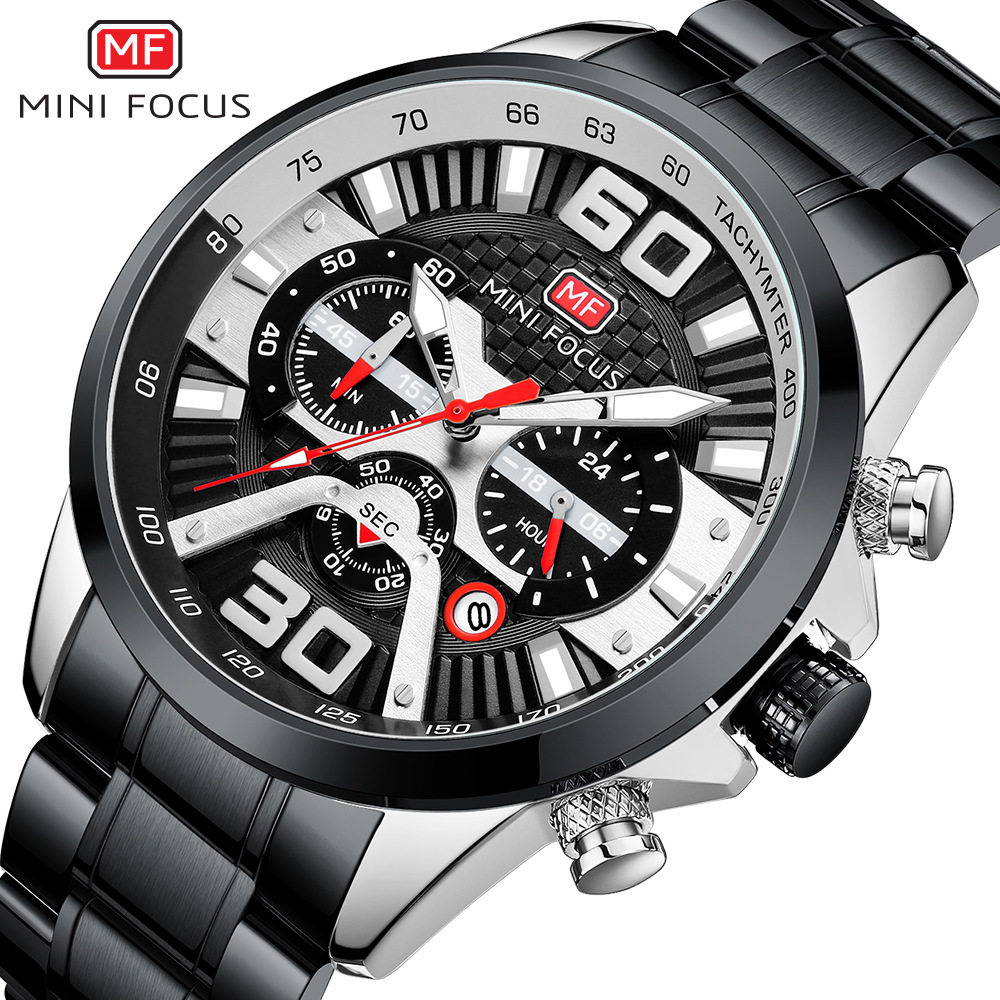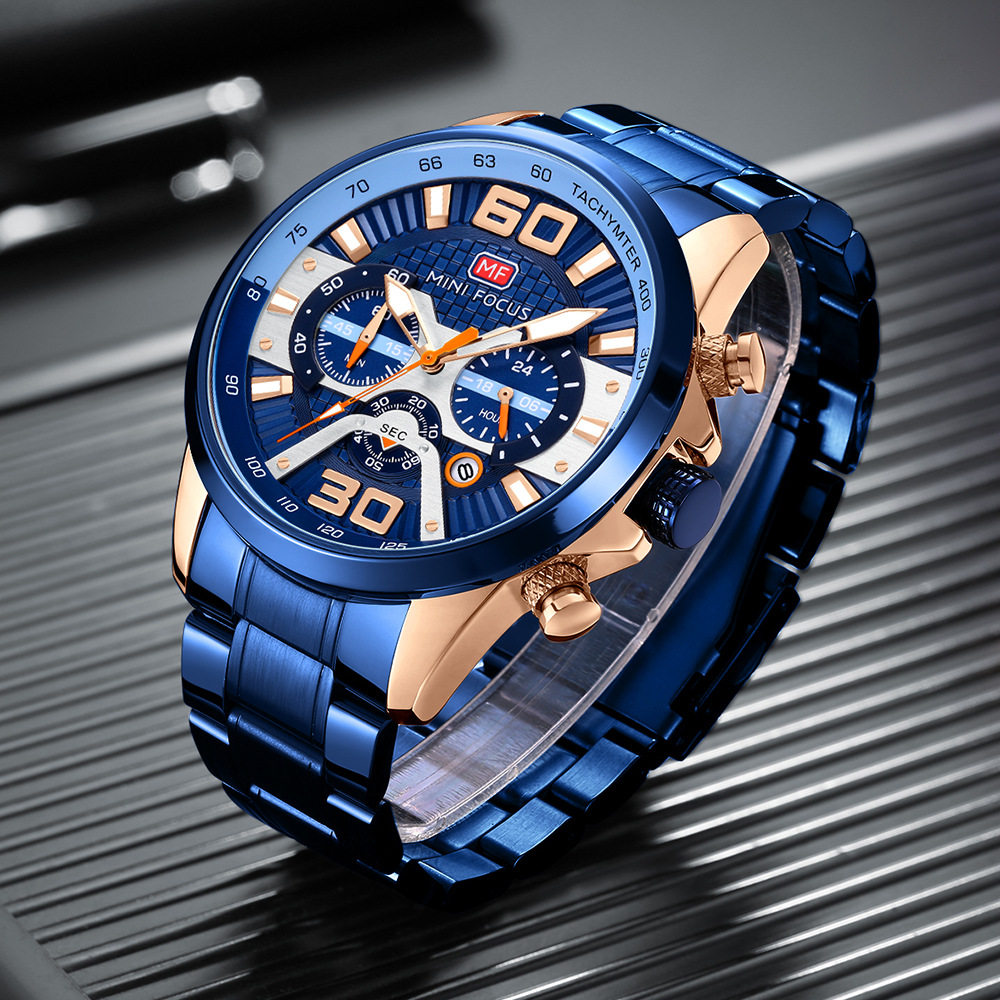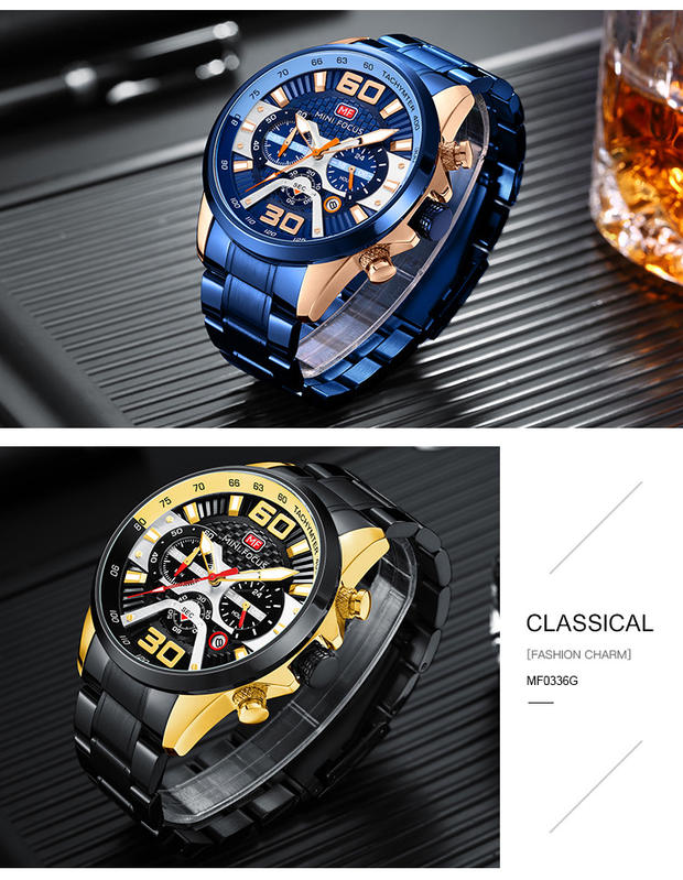 Minifocus Watch Explosion Calendar Calendar Night Light Водонепроницаемый стальный ремень (заменяемая полоса) Мужские часы 0336G