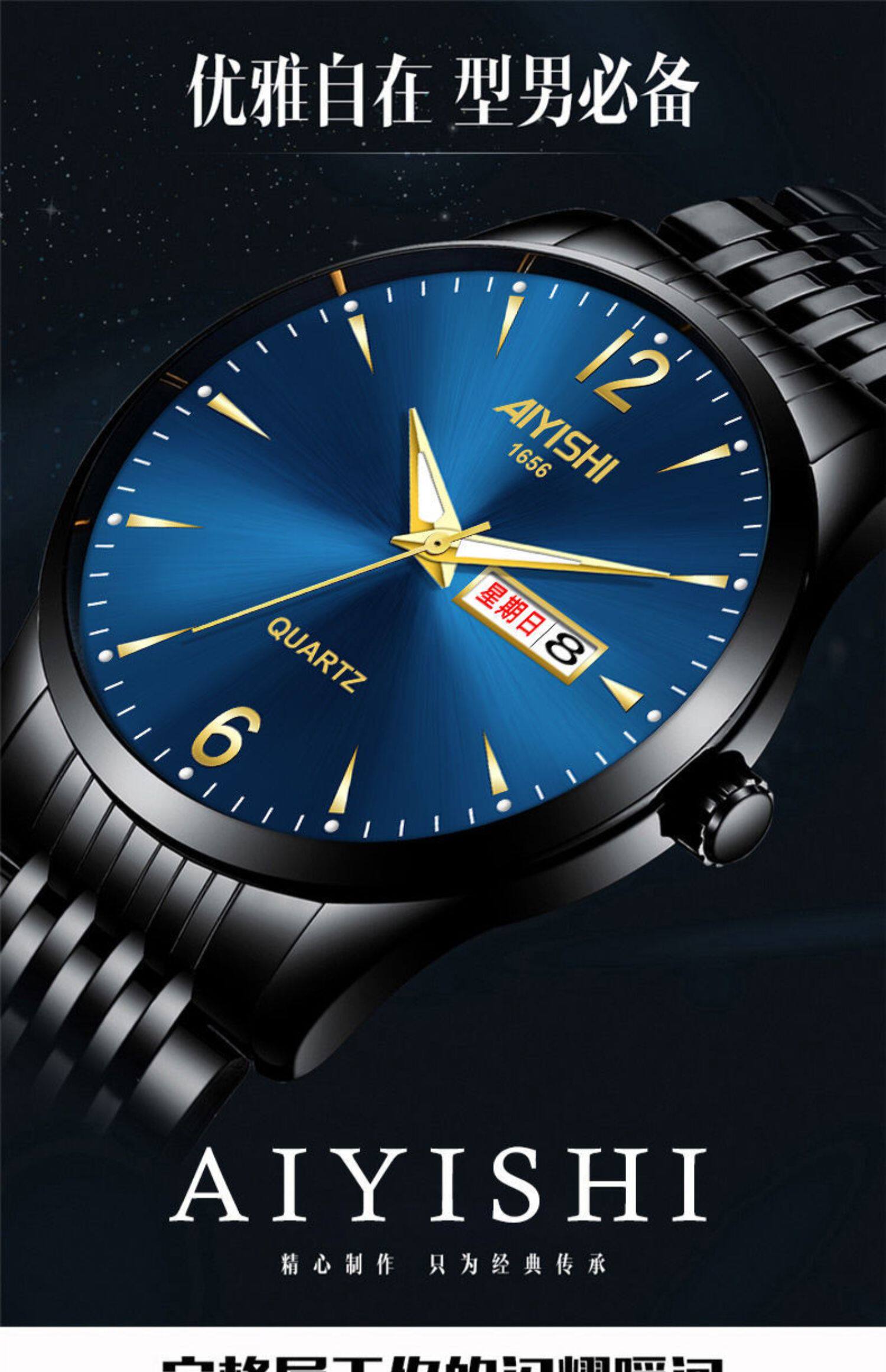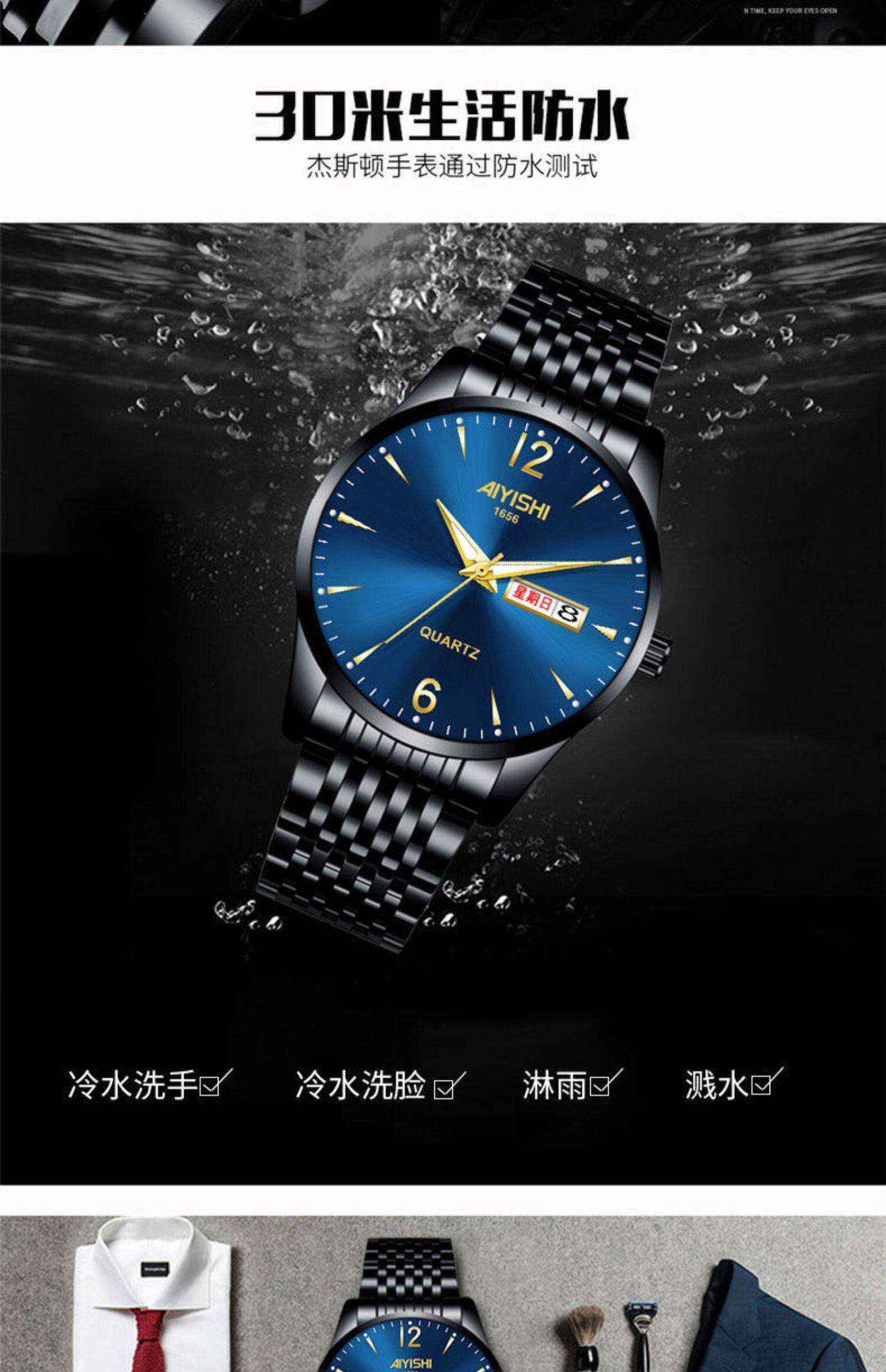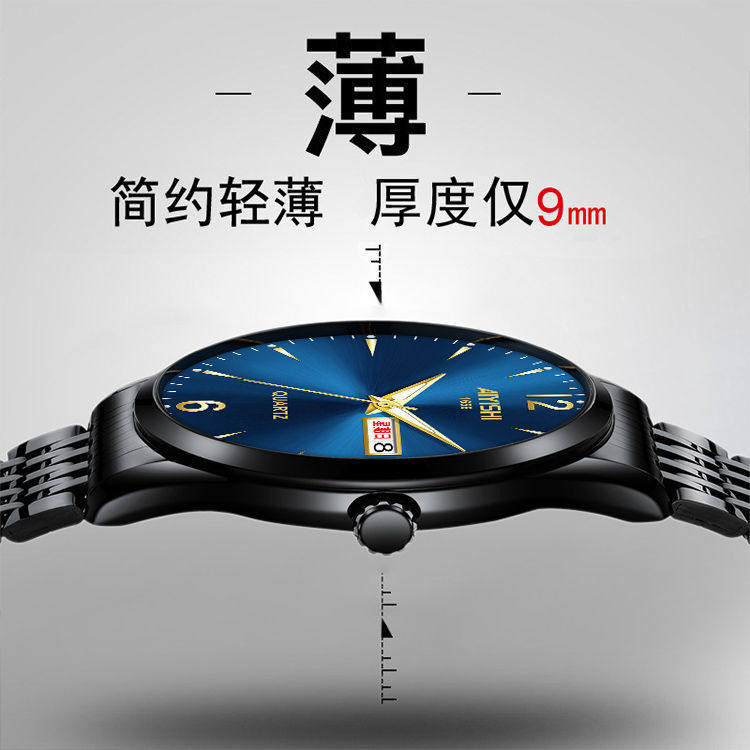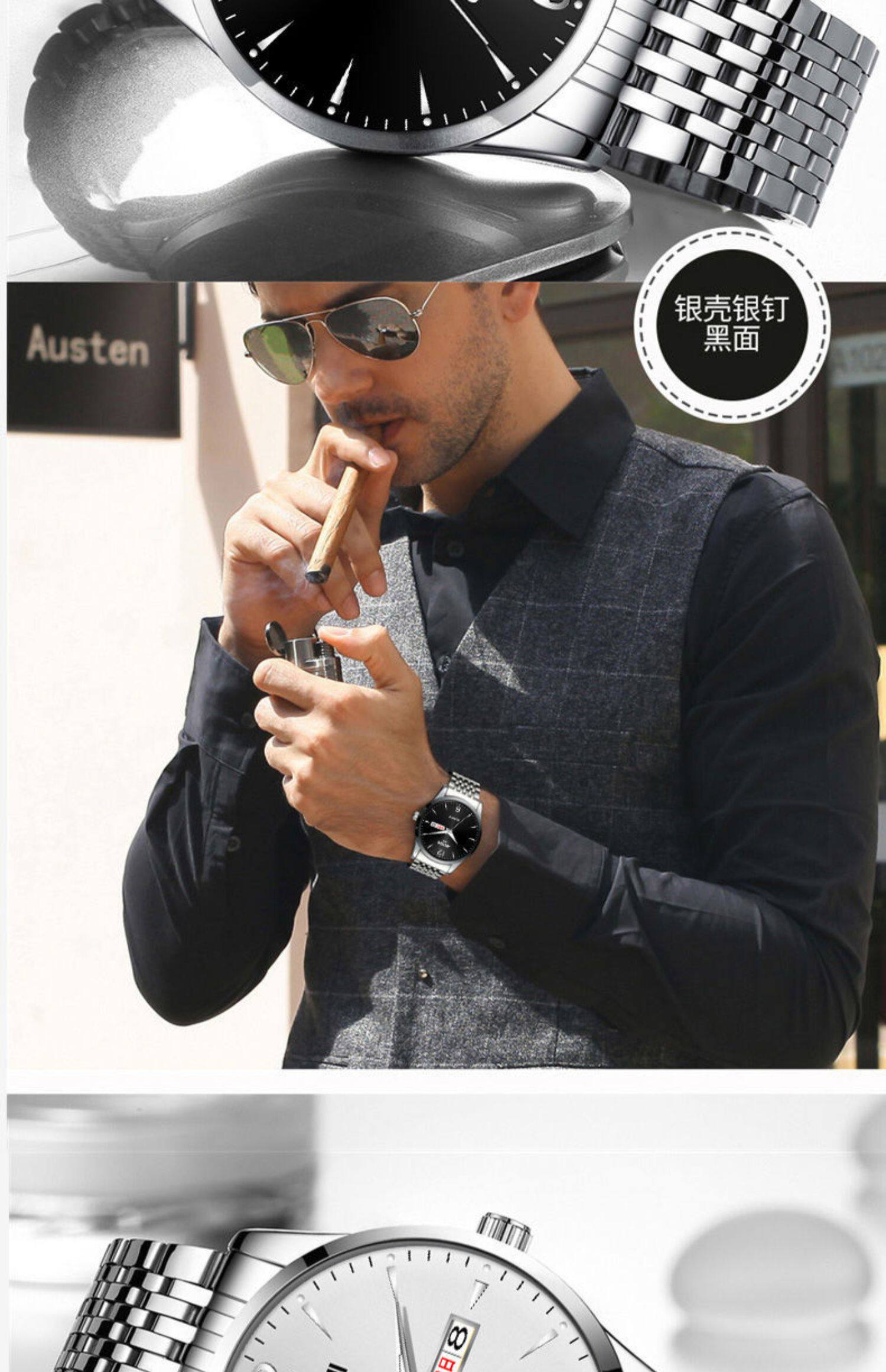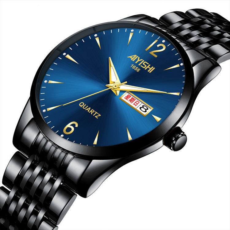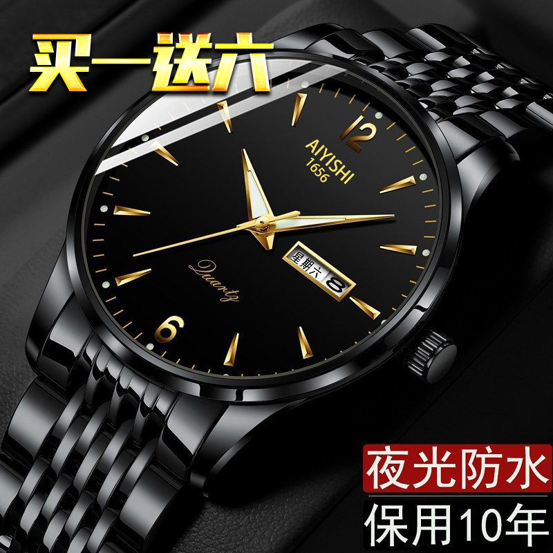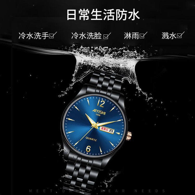 Швейцарские часы, механические водонепроницаемые кварцевые часы, стальной ремешок, черный календарь, Швейцария, полностью автоматический