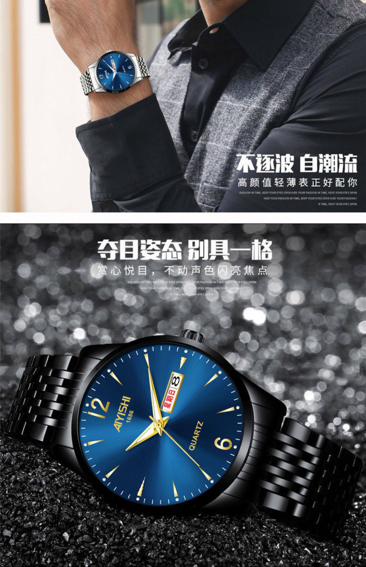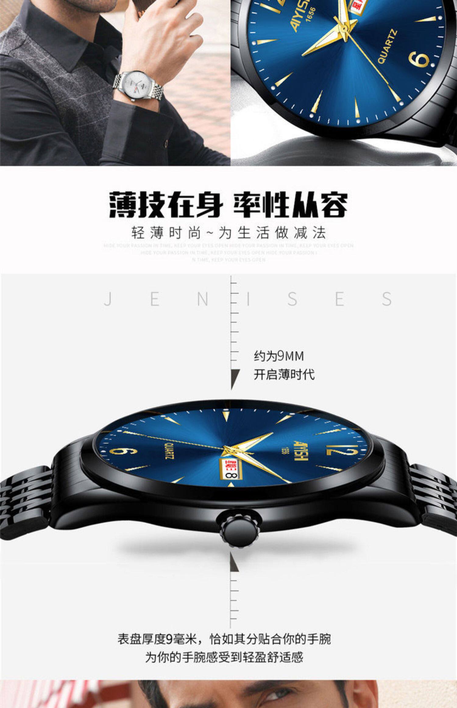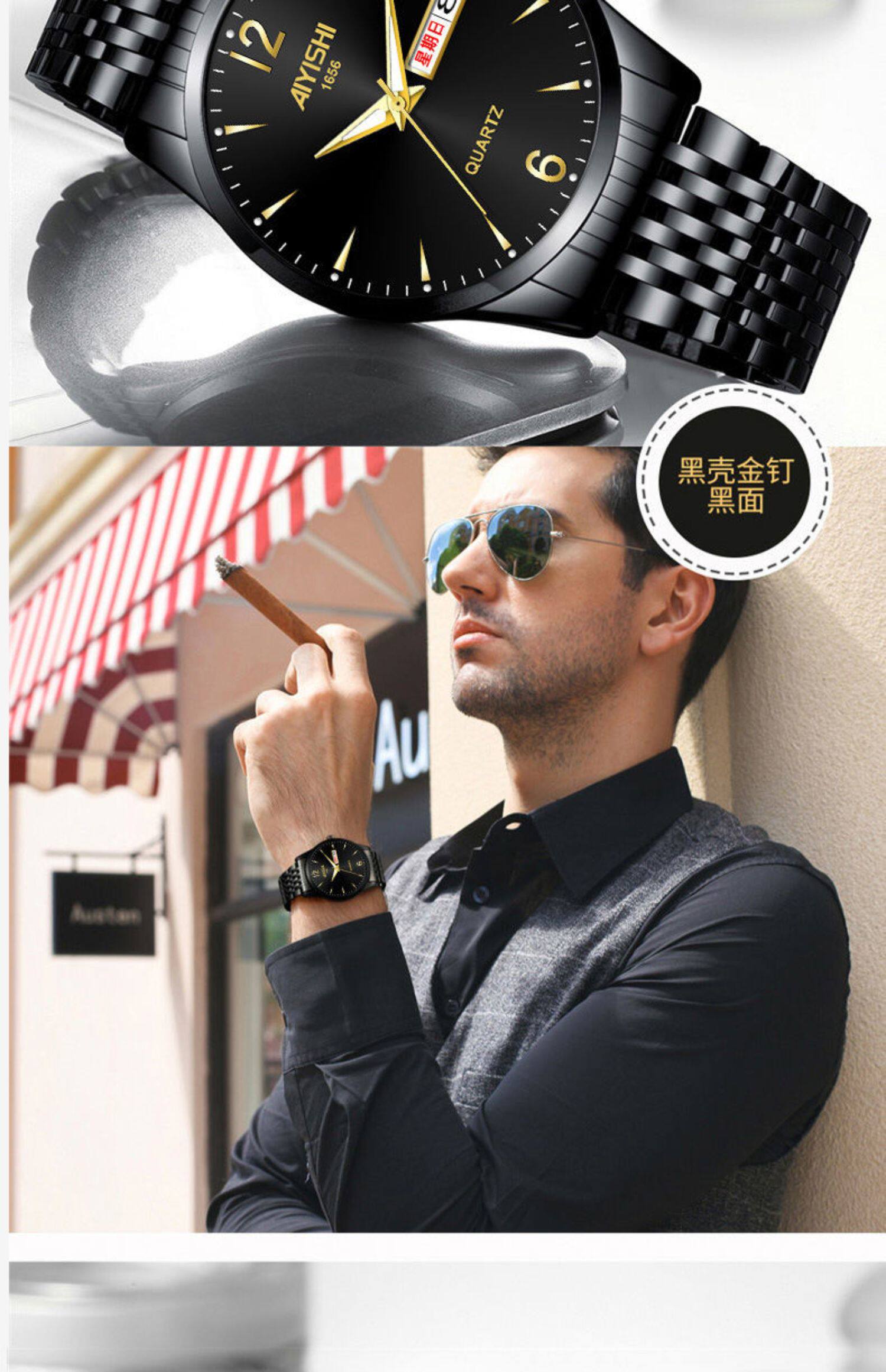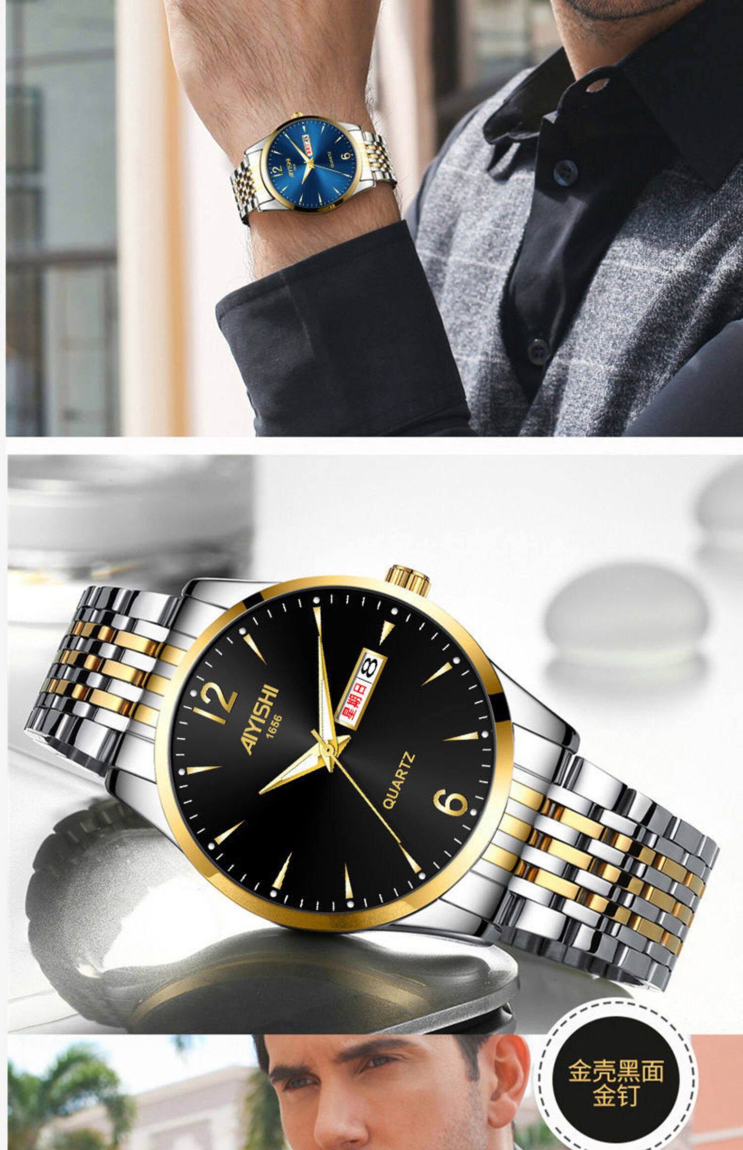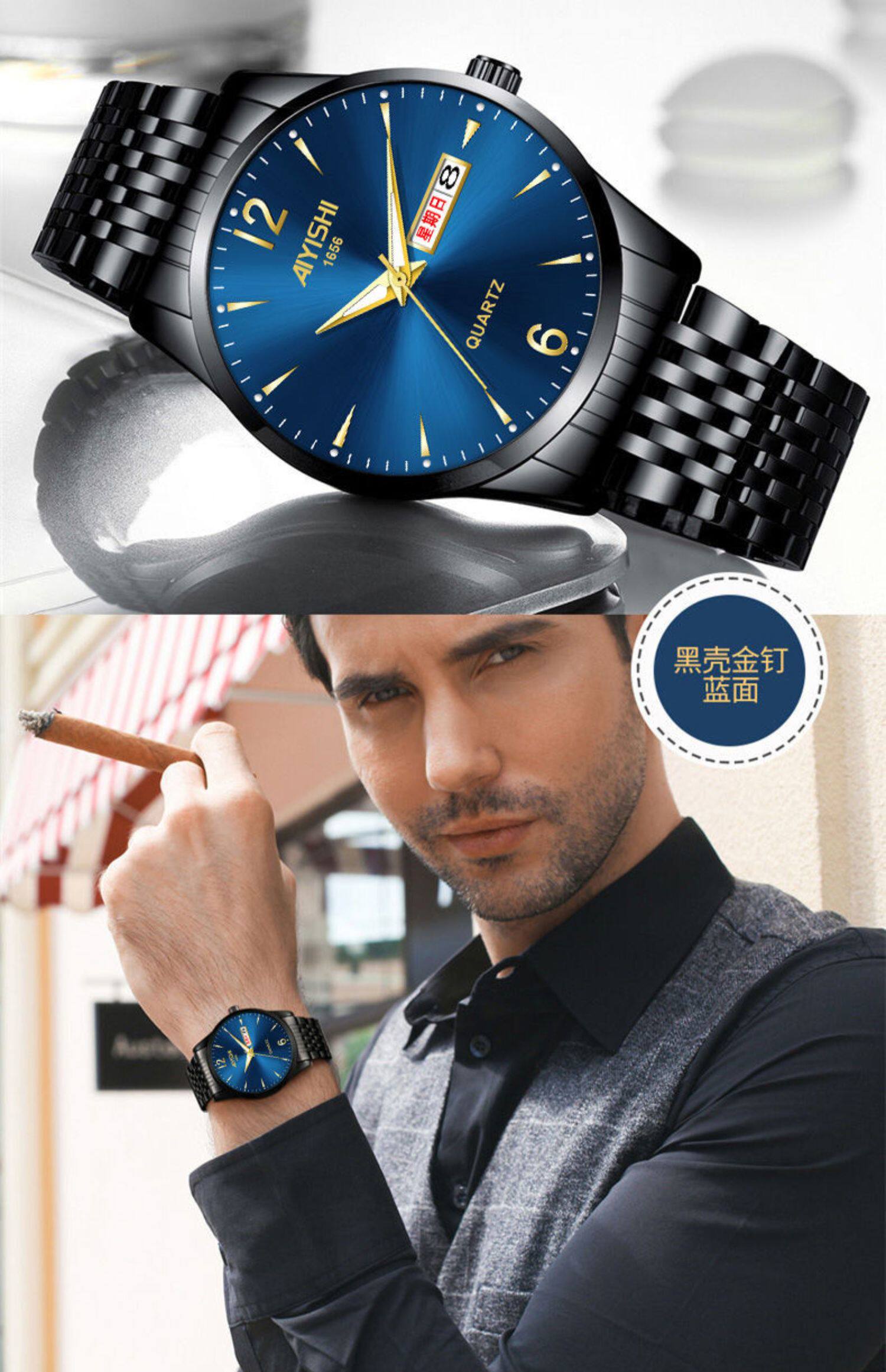 Швейцарские часы, механические водонепроницаемые кварцевые часы, стальной ремешок, черный календарь, Швейцария, полностью автоматический