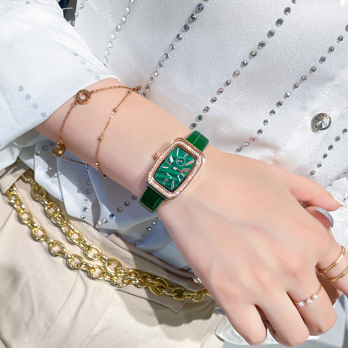 | Цвет: | Зеленый, Маленький зеленый пояс, Черный ремень, Стальной ремешок, Маленькие зеленые часы |