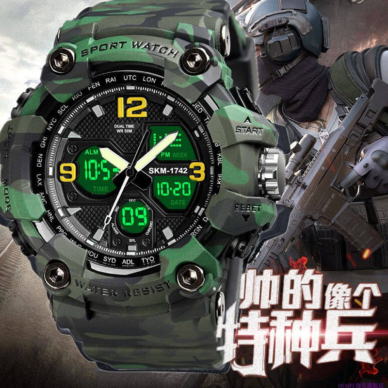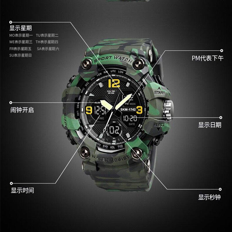 | Цвет: | Черный (двойное время+светящийся+будильник), Синий (время+светящийся+будильник), Серый камуфляж (двойное время+светящееся+будильник), Зеленый камуфляж (время+светящаяся+тревога) |