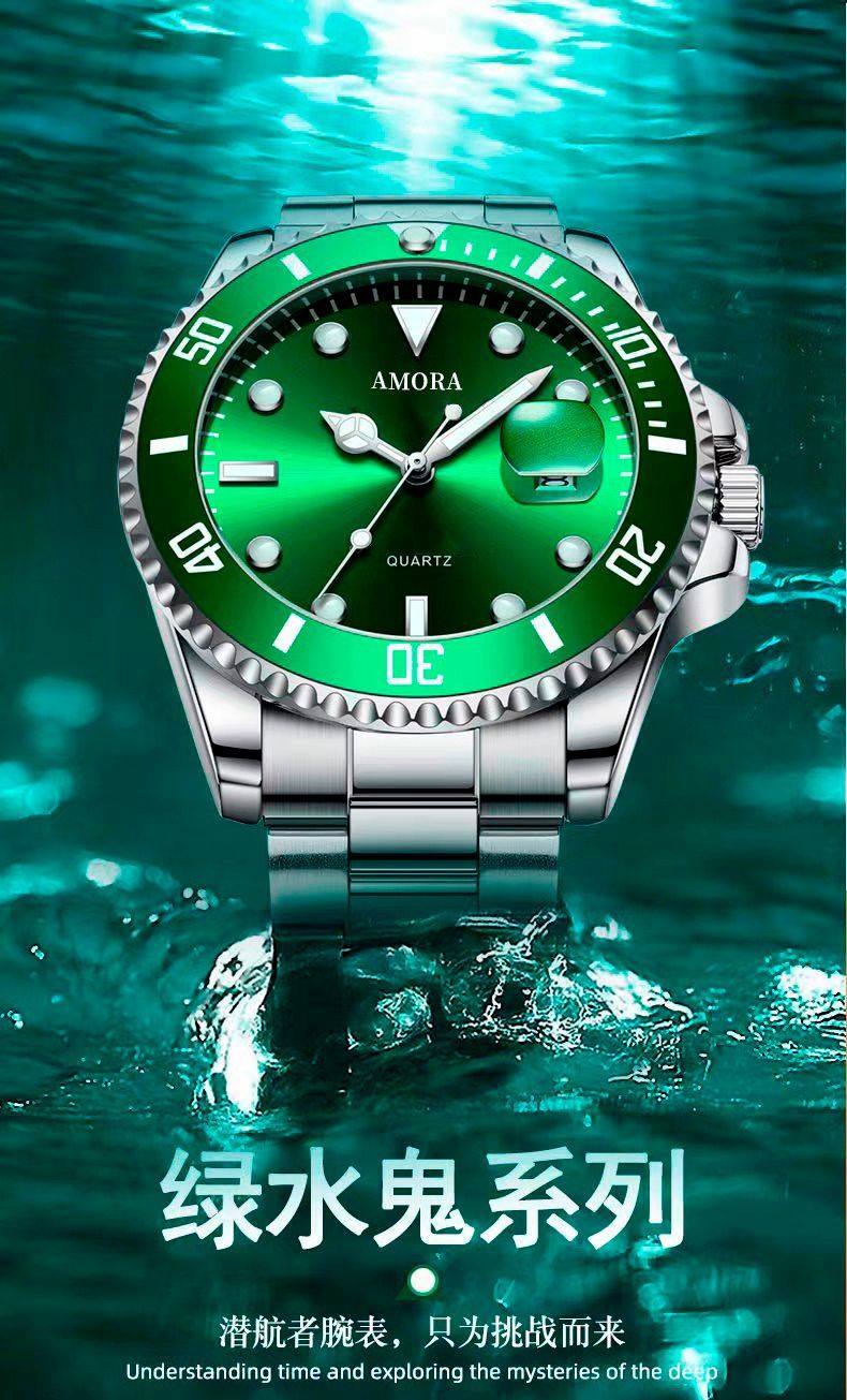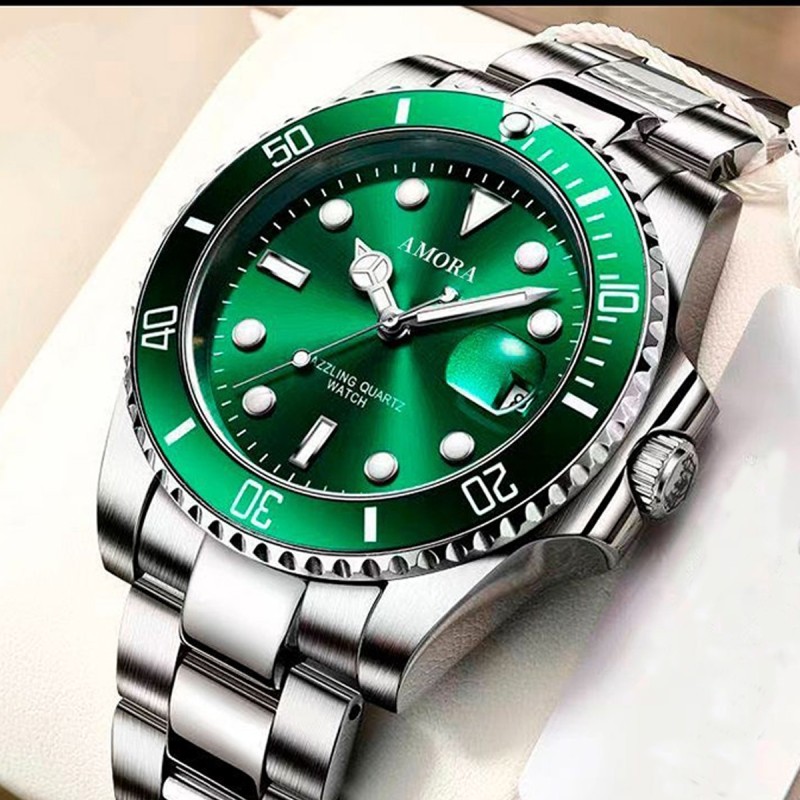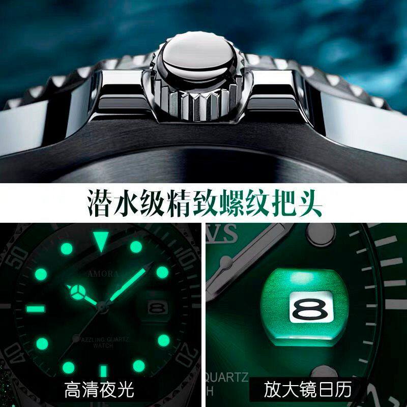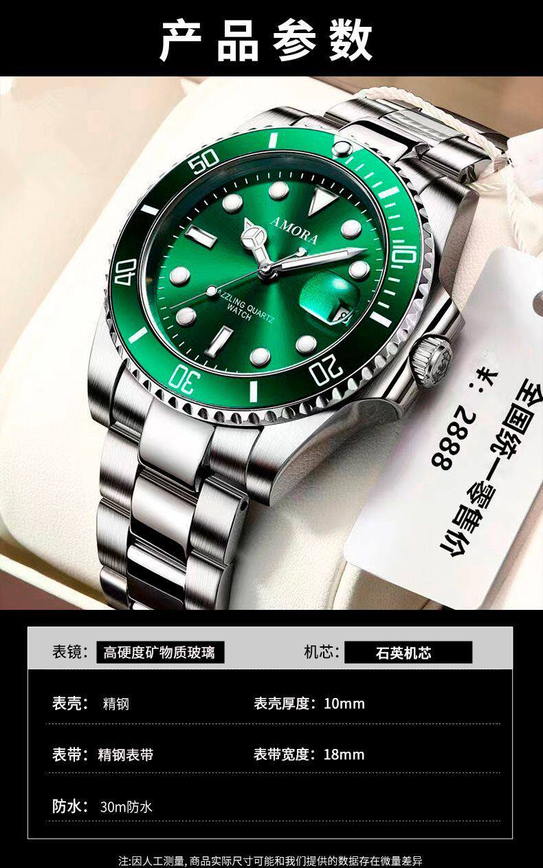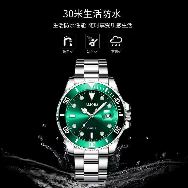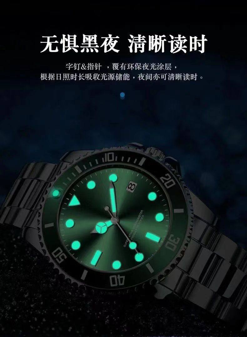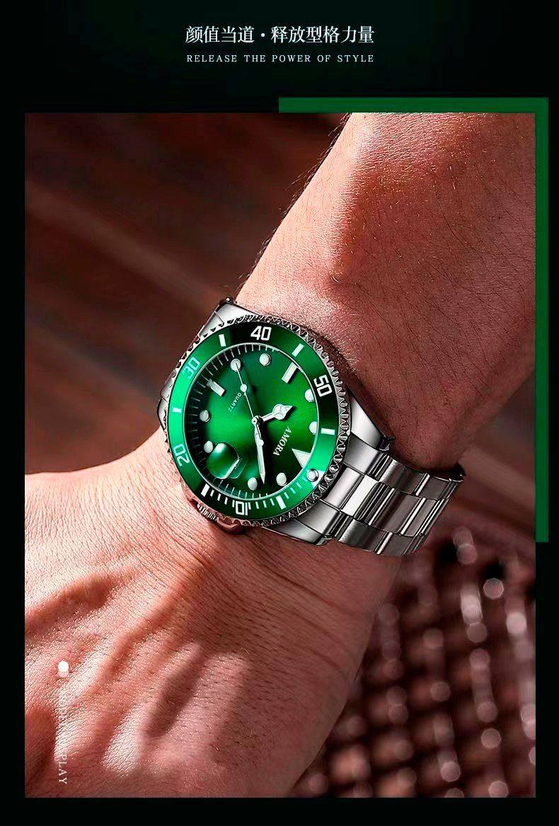 Модные механические кварцевые часы, водонепроницаемый стальной ремешок, зеленый календарь, полностью автоматический