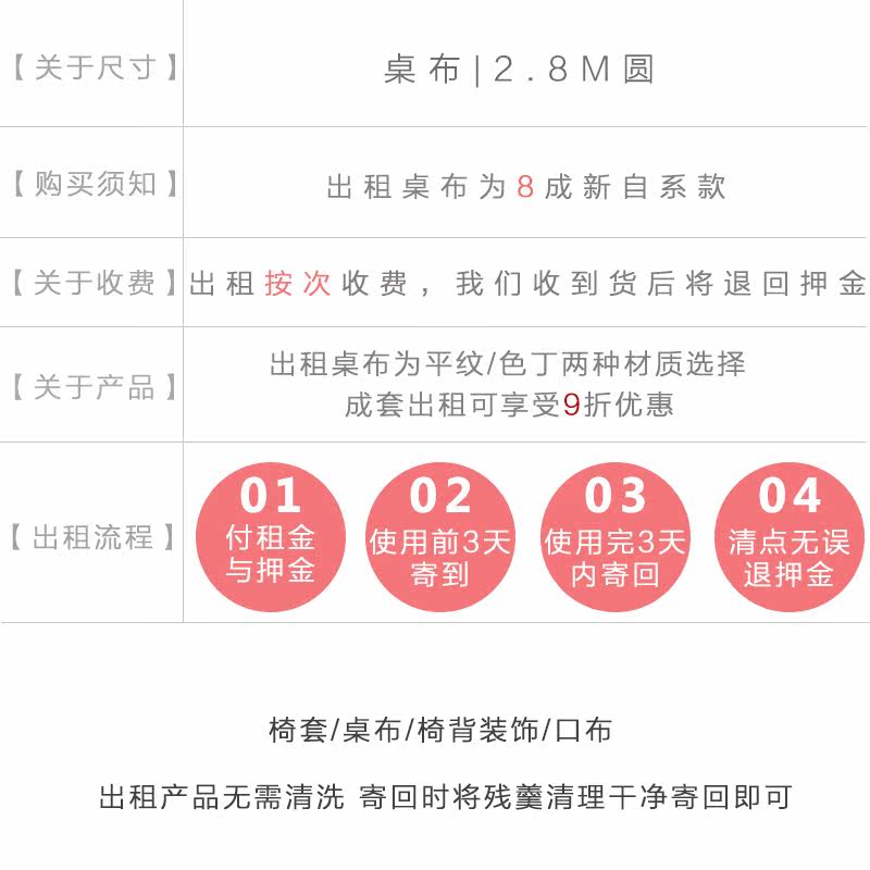 1,Технические характеристики: арендованная таблица на кубиках на кубиках составляет 2,8 метра круглого диаметра (со швами), а плоская скатерть - 3 метра круглый диаметр