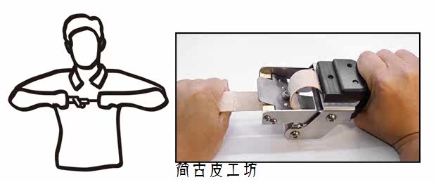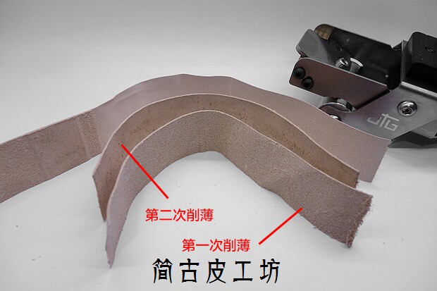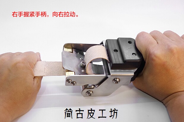 [削皮需要的力道大小与皮料的硬度有直接关系,削软皮只要是成年人都可以轻松完成;植鞣革,疯马皮,这些就需要一点力道,您如果能单手提起3-5公斤的重物,这个级别的皮料也不是问题;马缰,枥木这些最高硬度的皮料,对操作者臂力要求比较高,单手力量要求在7-8公斤。多数女性是无法单独完成的,需要两人协助,双手持削薄机,另][一人把握皮料一端。(西木有时候干脆脱了鞋踩住皮料,双手向上拉。)。同时,高硬度皮料不要一次削太深,太深了根本拉不动的,分多次,每次削浅一些,一般削两次就可以达到目的。另外说说削薄的手势,视频里西木是将皮料按在桌面上的,手臂伸直,这是为了拍视频的需要,其实我觉得最佳的施力方法是双手都紧握,手臂收回靠近身体拉动,类似使用拉力器的方式。]