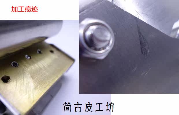 [机器是机械加工的,表面难免有刮痕和打磨的痕迹,介意的朋友请三思。把手可以抹一些皮具保养用的牛角油马油什么的可以消除痕迹,把手上的黑色螺丝是高硬度螺丝,油脂还可以起到很好的保护作用。主体是不锈钢,刀片夹是黄铜,有打磨工具的朋友完全可以磨到镜面效果。]