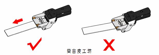 [4、如下图,削皮时尽量保持皮料平直,走直线拉动,如果皮料倾斜,会随着滚轮滚到刀片边缘卡住。如果发现倾斜程度严重,应该停下来重新调整位置保持平直,只要厚度控制螺杆没有变化,中途停下再来是没有影响的。]