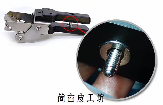 [手柄上的螺杆就是用来控制削皮的深度的,如下图所示,类似杠杆原理,调节螺杆的深度可以控制刀片与滚轮之间的距离,就可以控制削皮的深度了。]