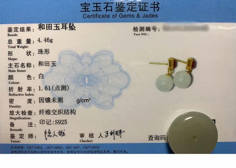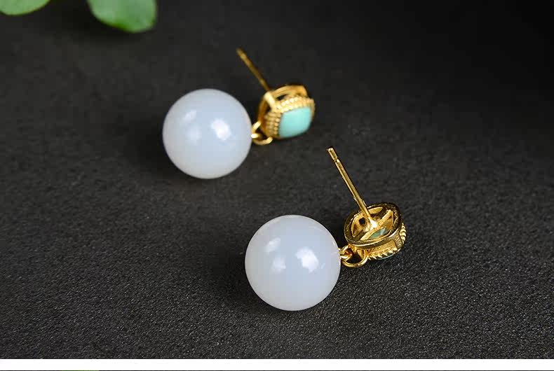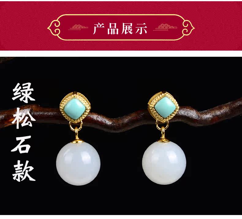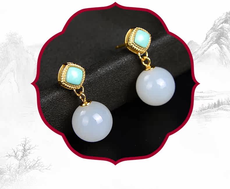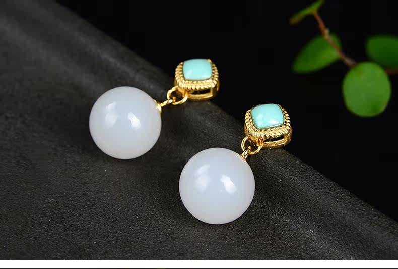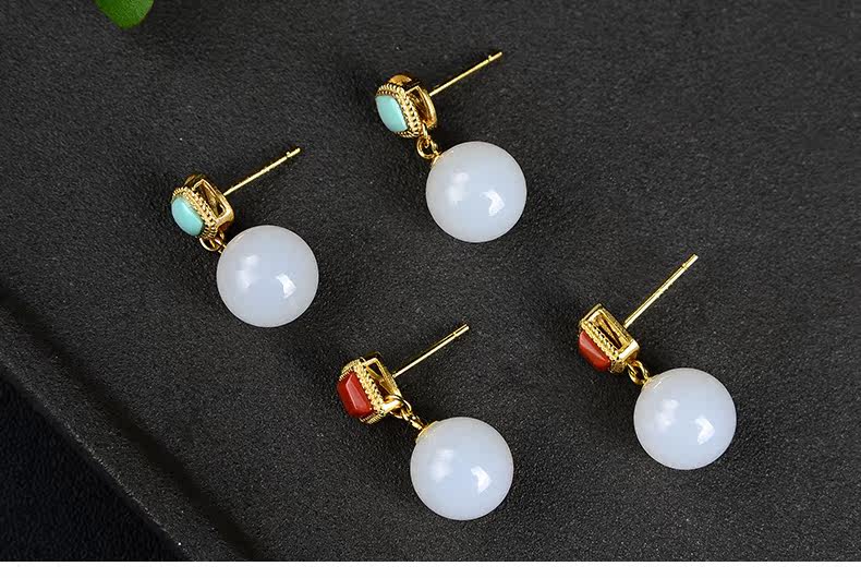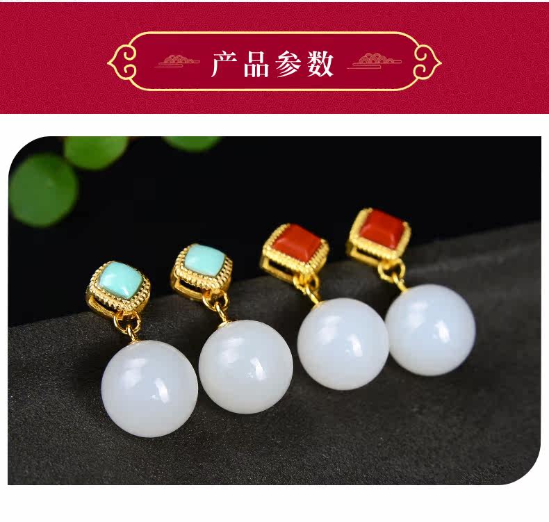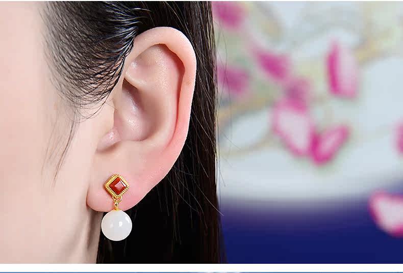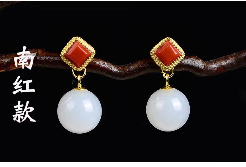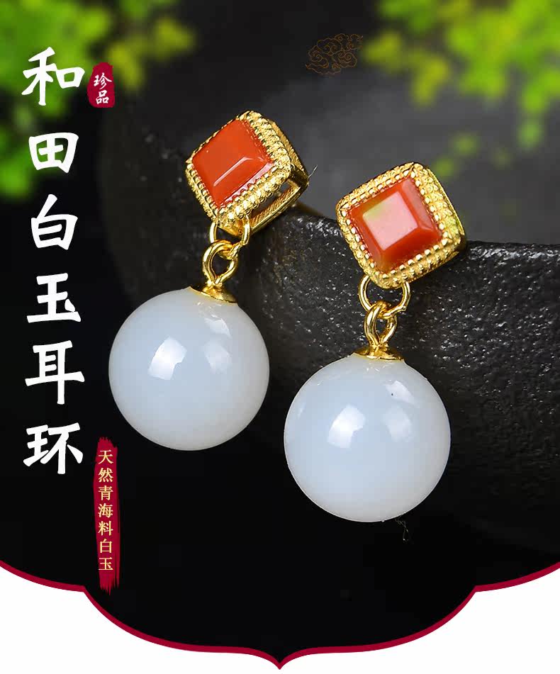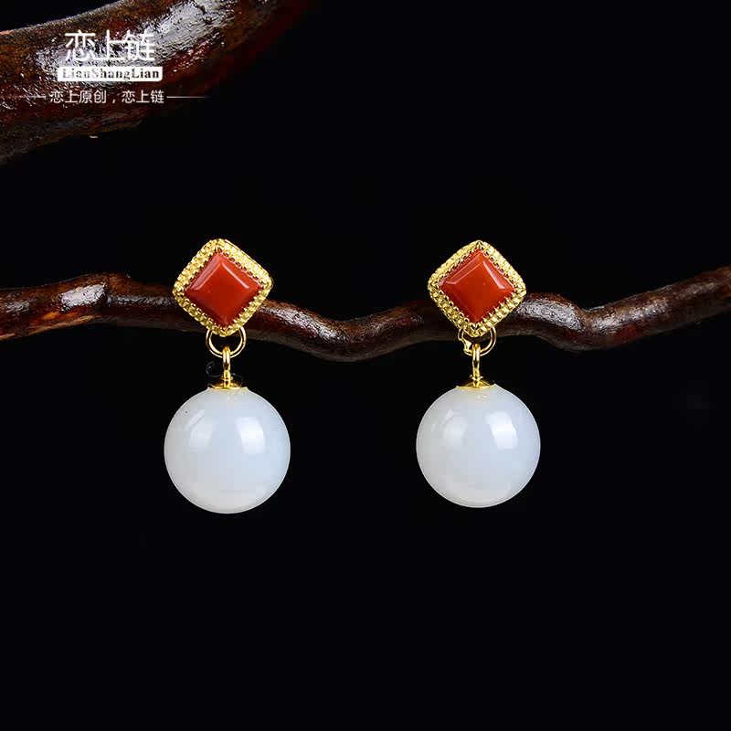 恋上链 Натуральные серьги из нефрита, красная инкрустация камня из белого нефрита, серебро 925 пробы
