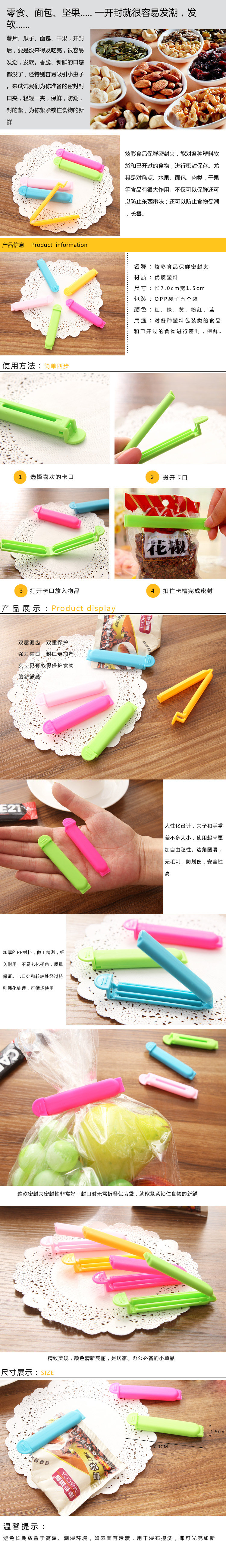 Использование товара: подходит для различных пластиковых пакетов и пищевых пакетов, которые были открыты.В частности, он применяется к приготовленным продуктам, таким как сухофрукты, хлеб, хлеб, мясо и водные продукты.Эффективно держите пищу свежей и предотвращайте шашлыки для еды.