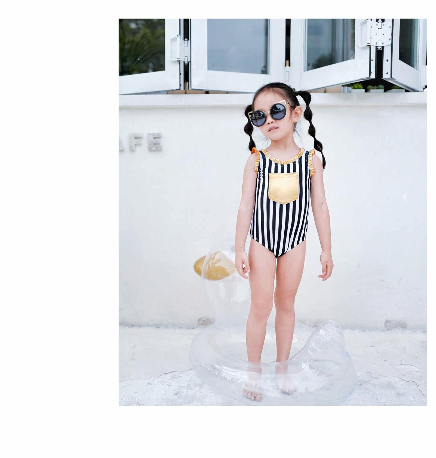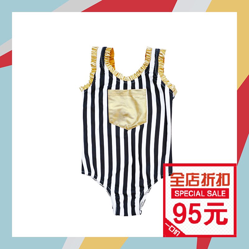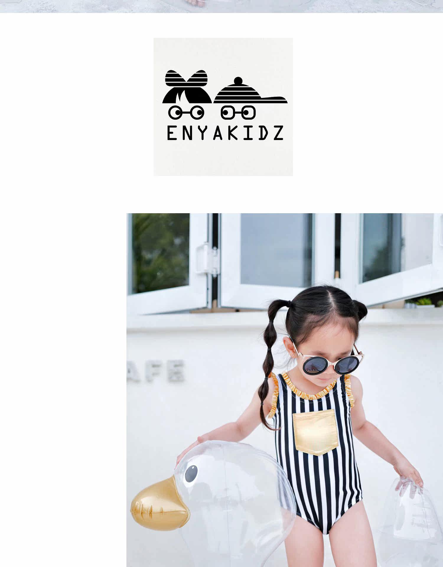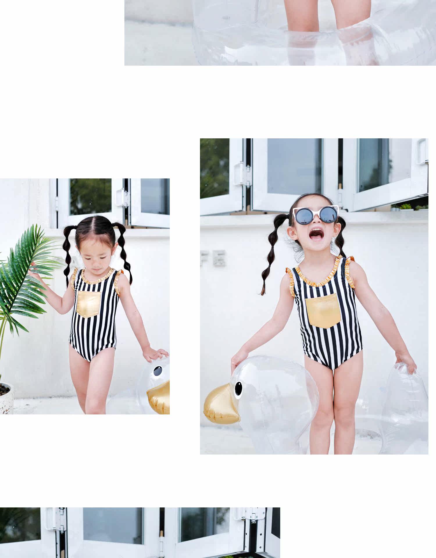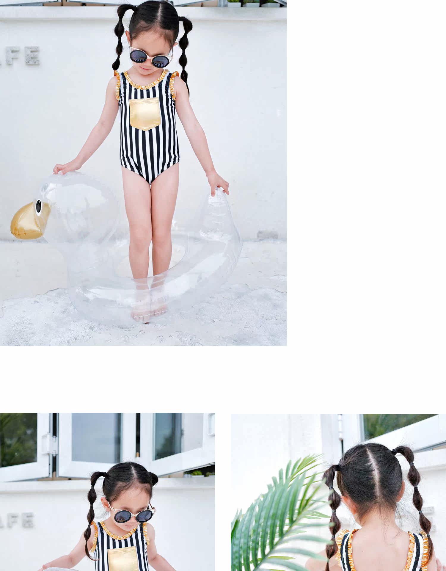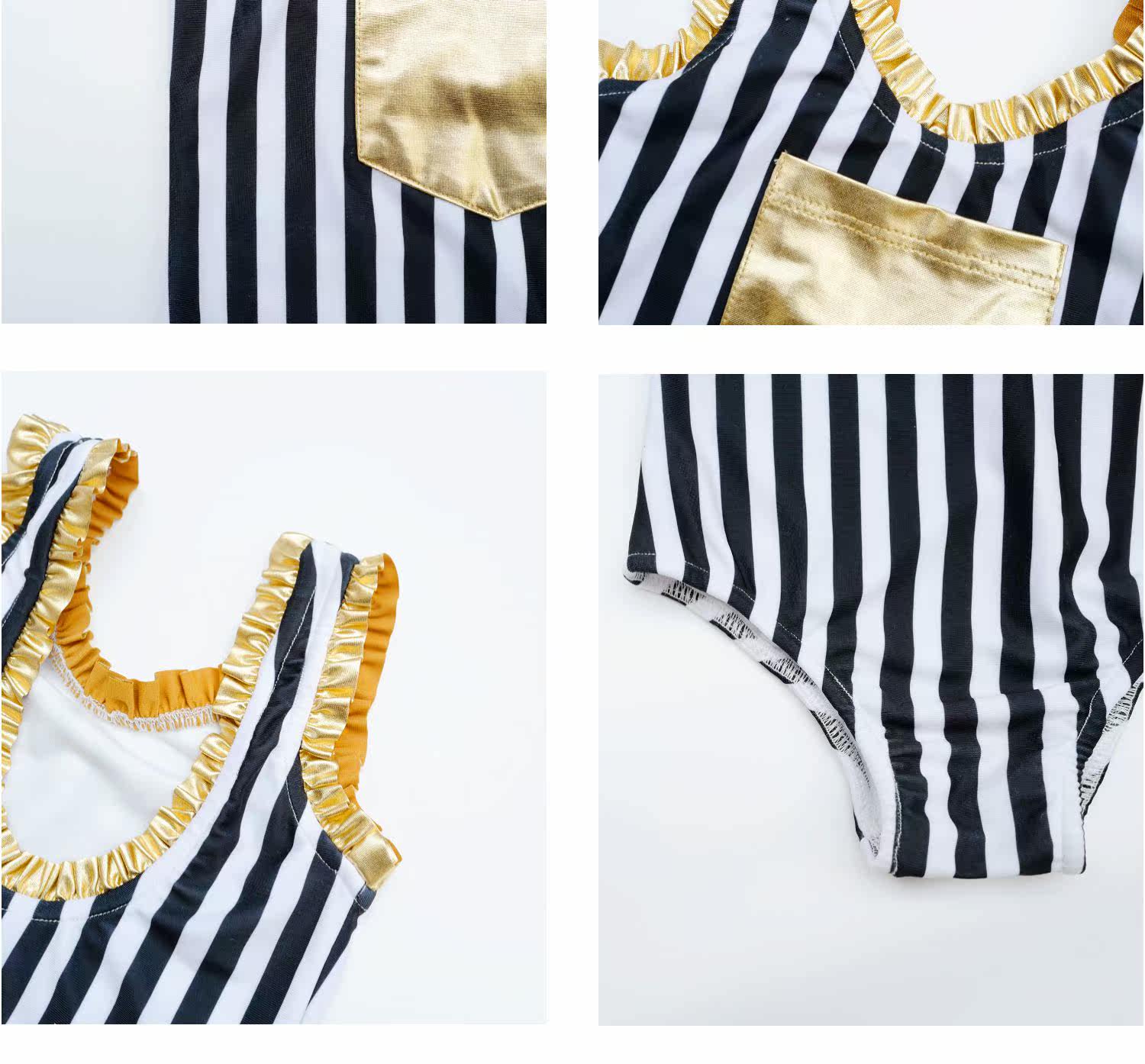 Enyakidz 19ss Эксклюзивный индивидуальный ребенок -ребенок черно -белый вертикальный полосатый золотой карман декоративный купальник