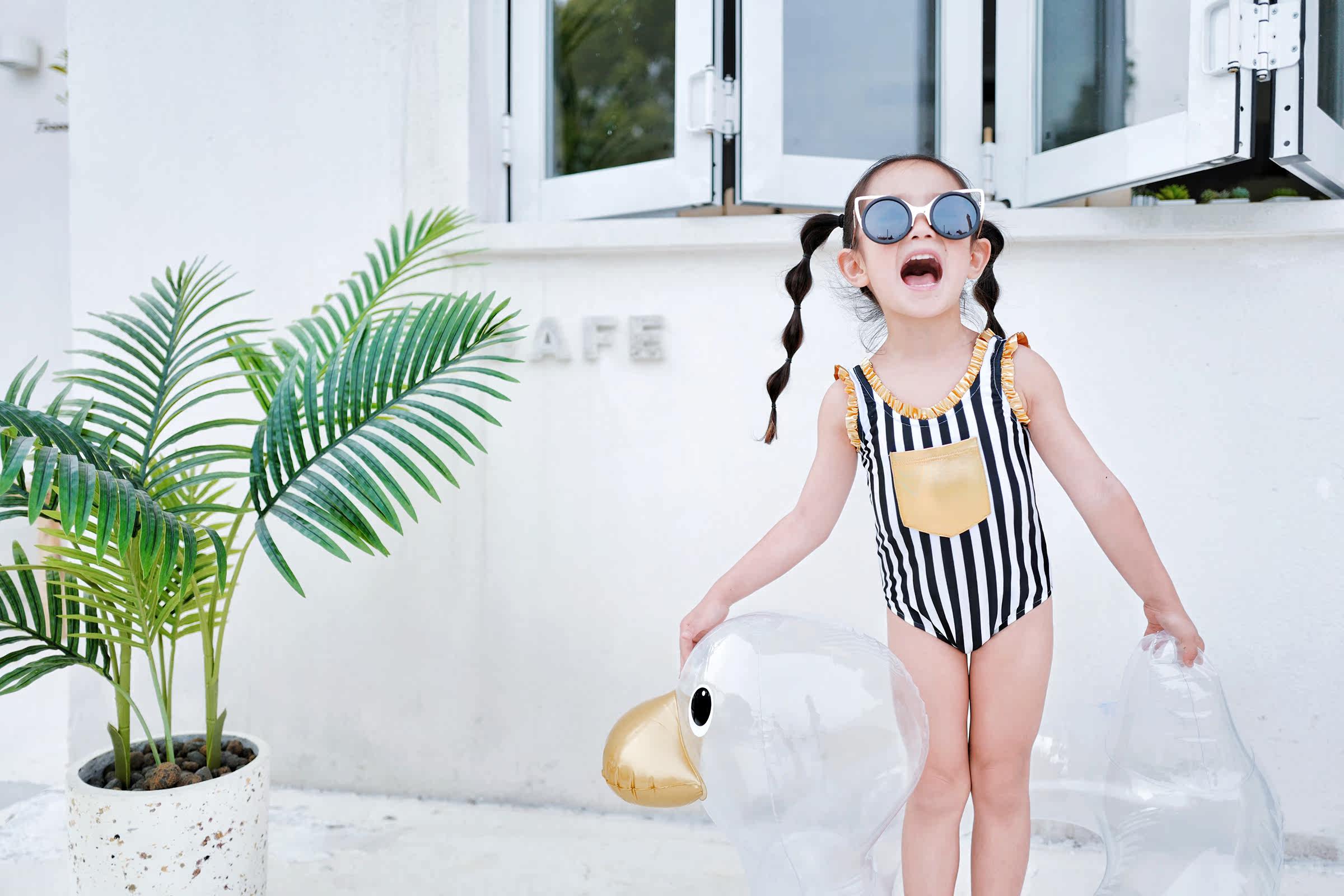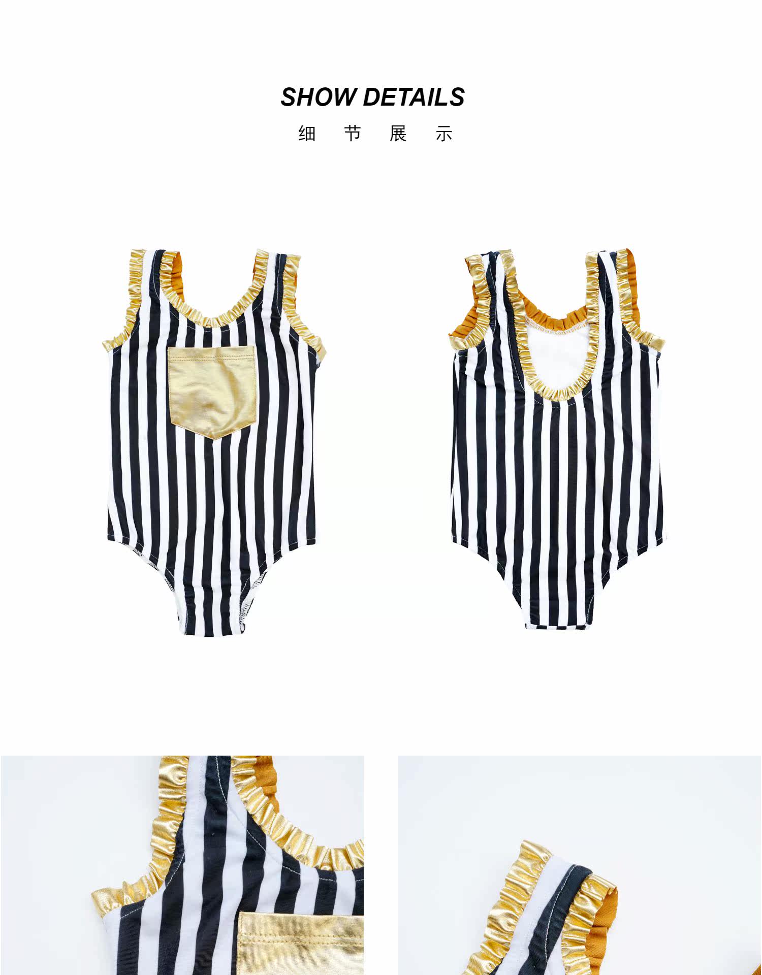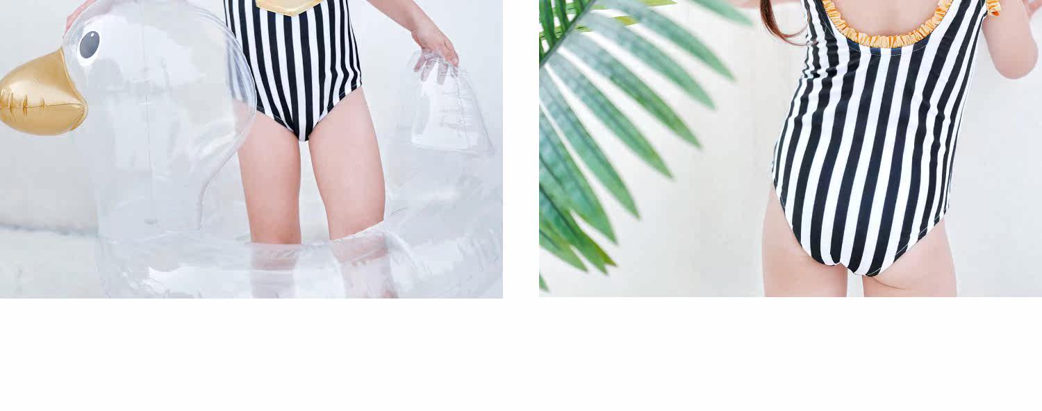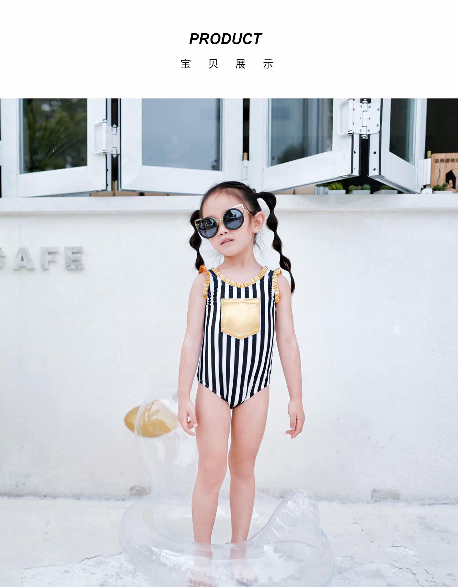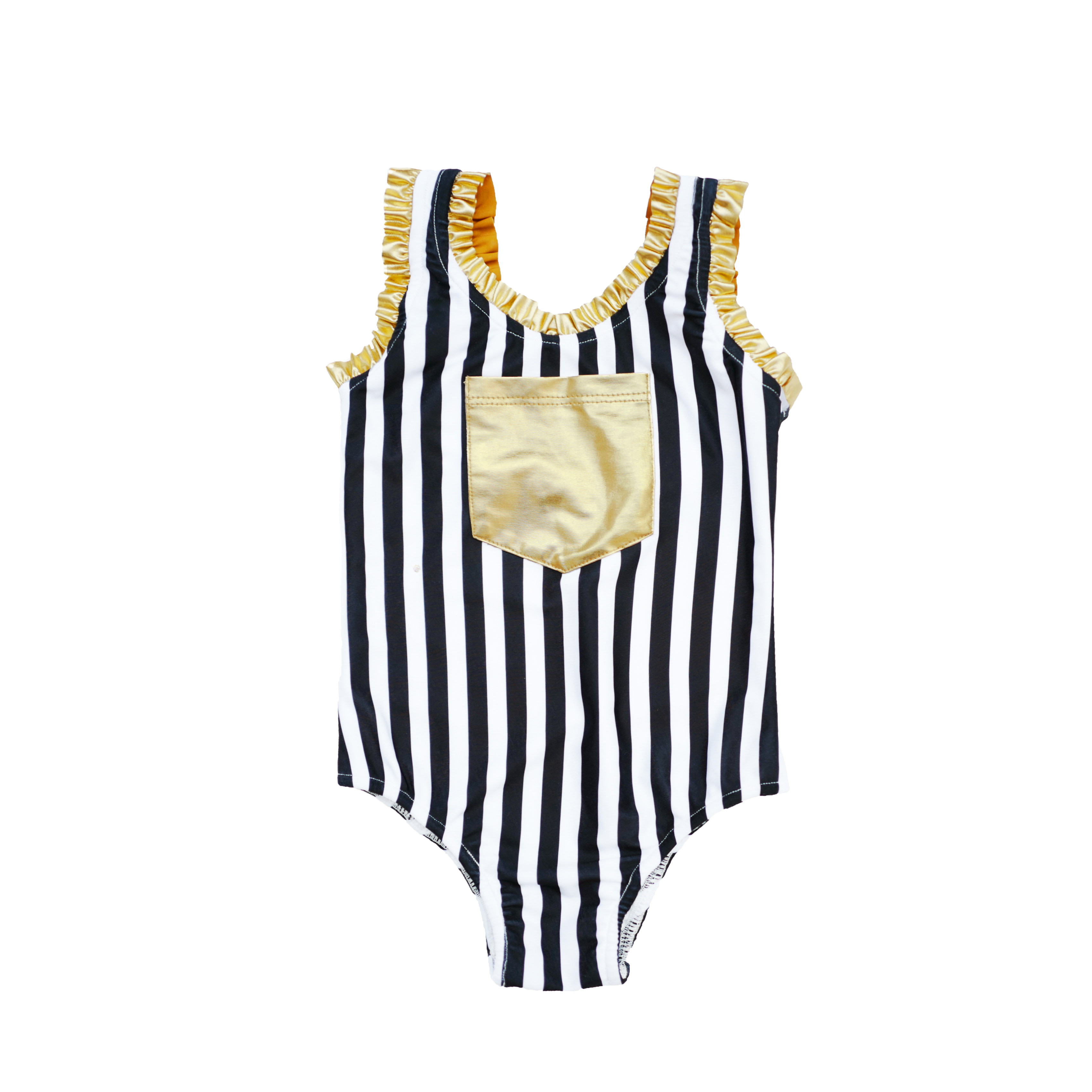 Enyakidz 19ss Эксклюзивный индивидуальный ребенок -ребенок черно -белый вертикальный полосатый золотой карман декоративный купальник