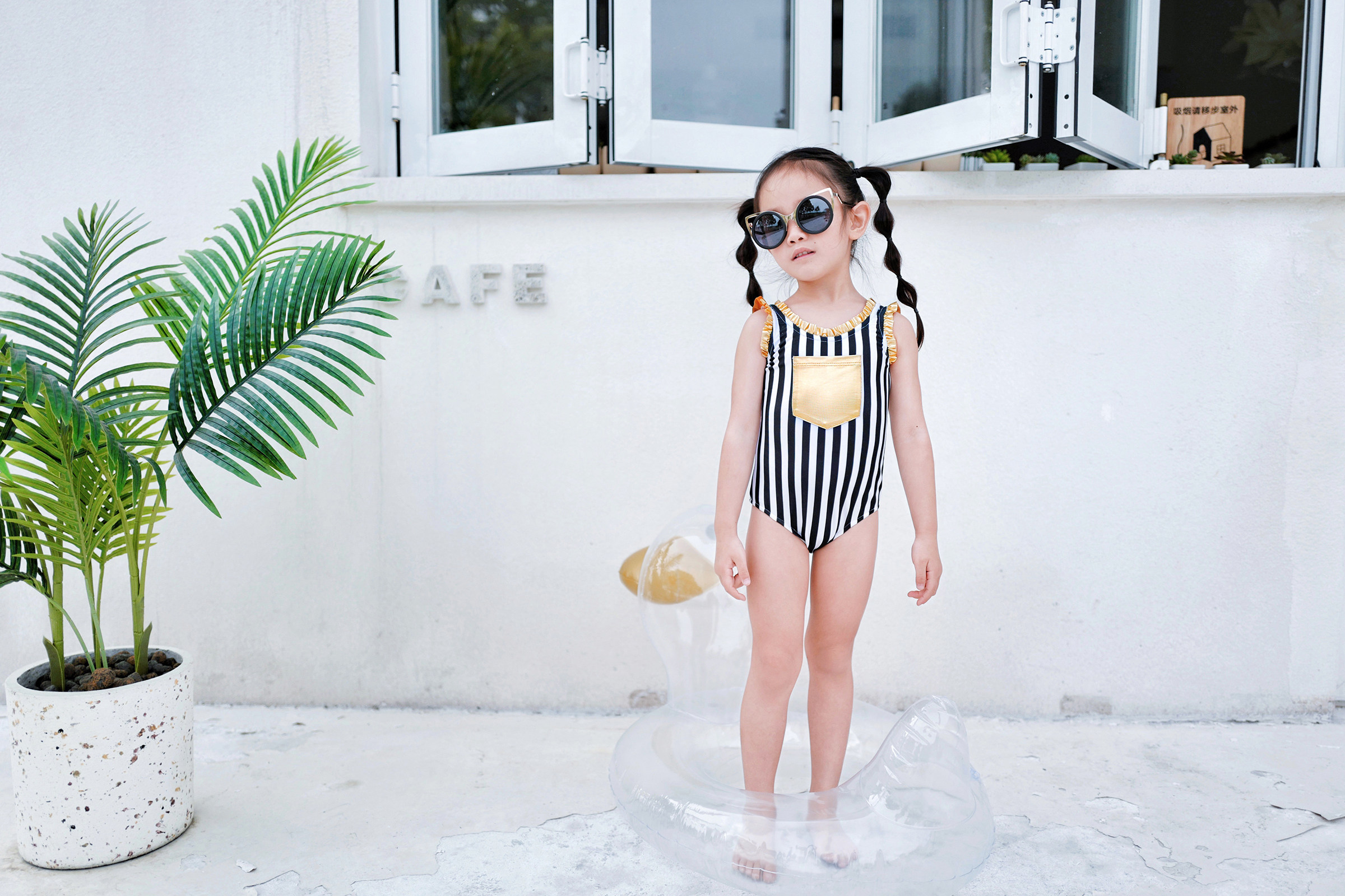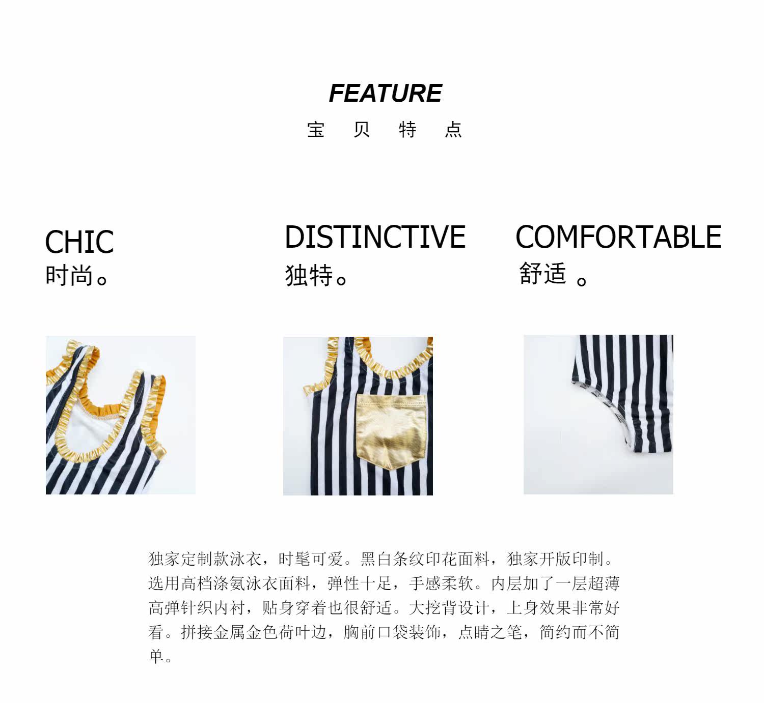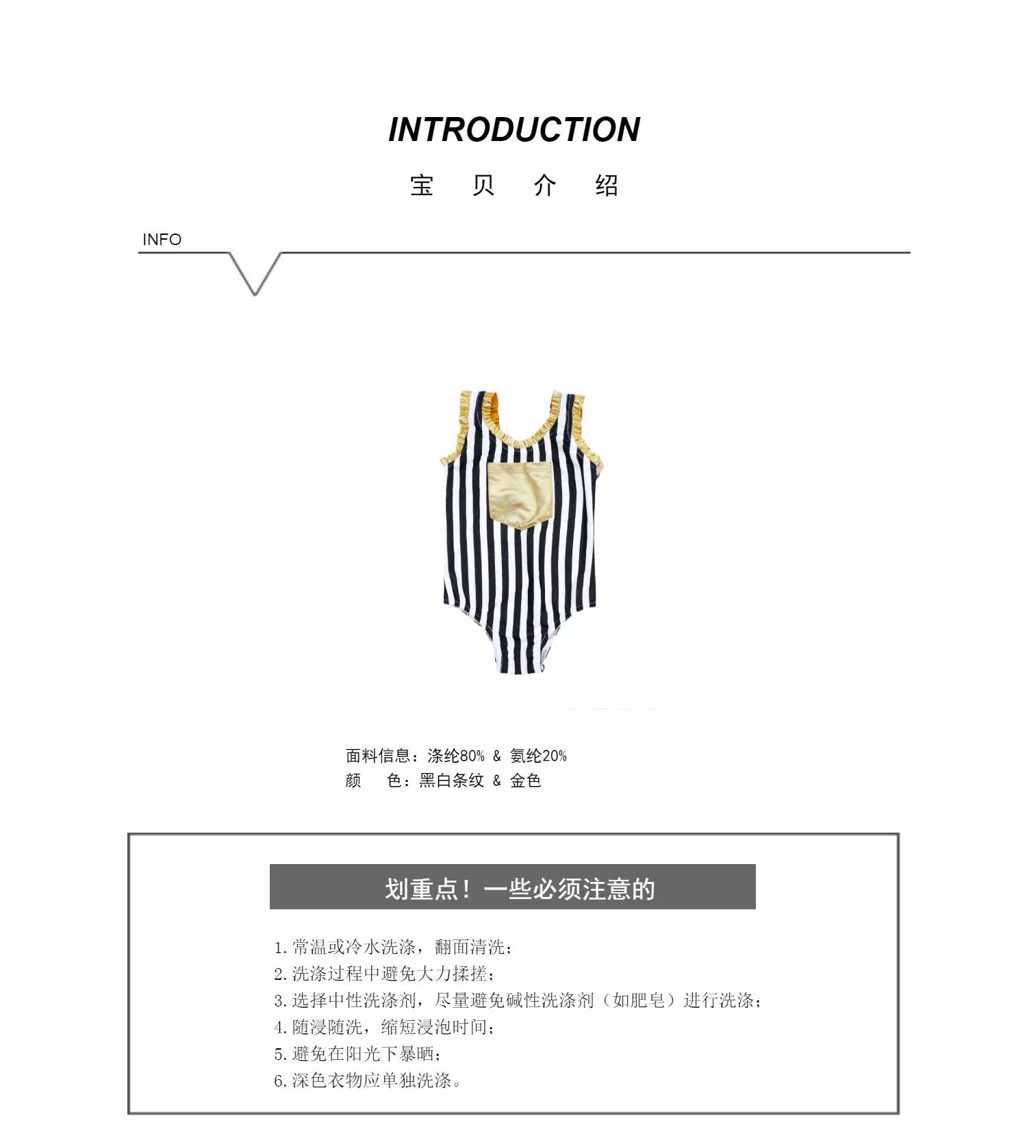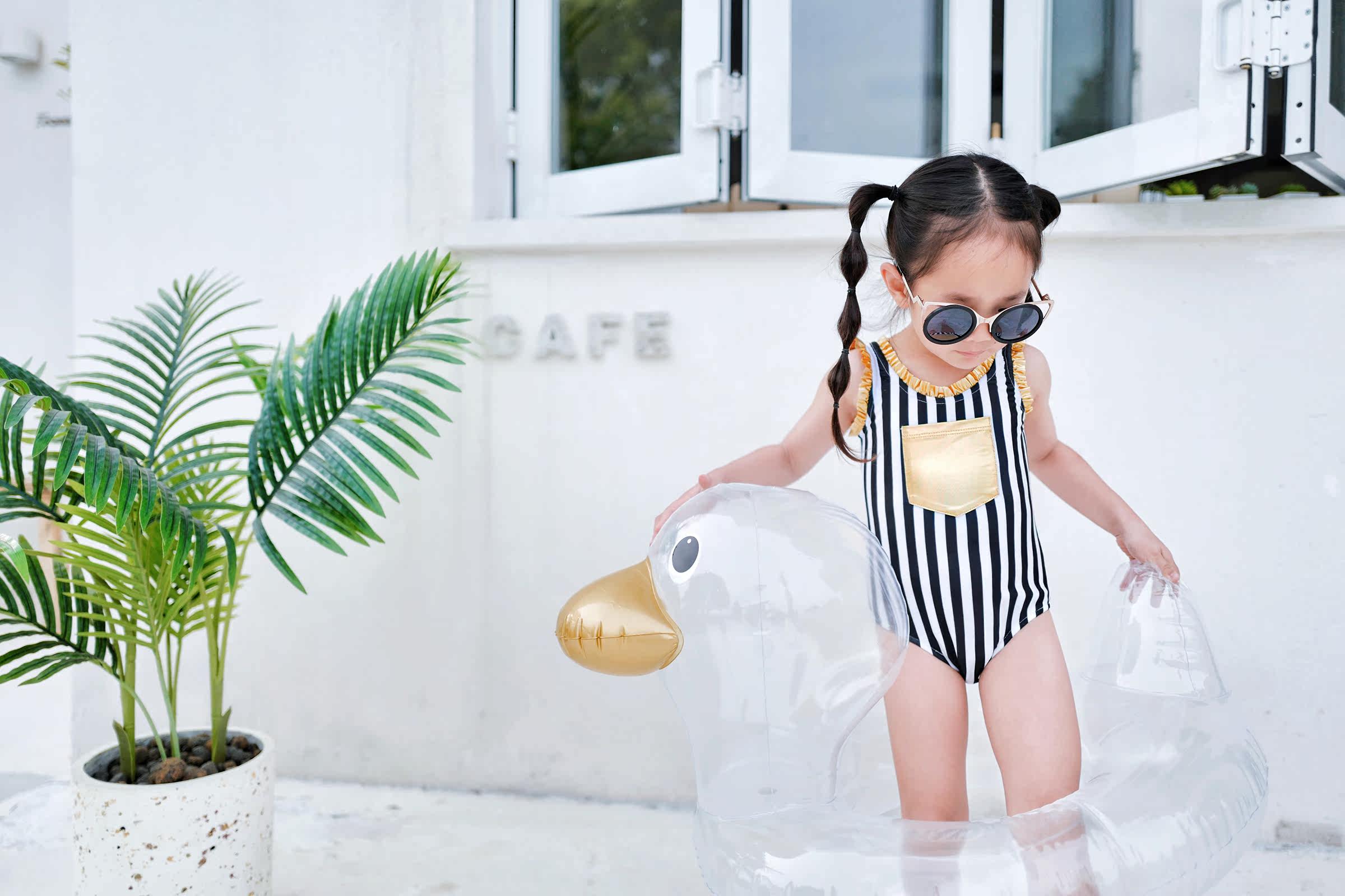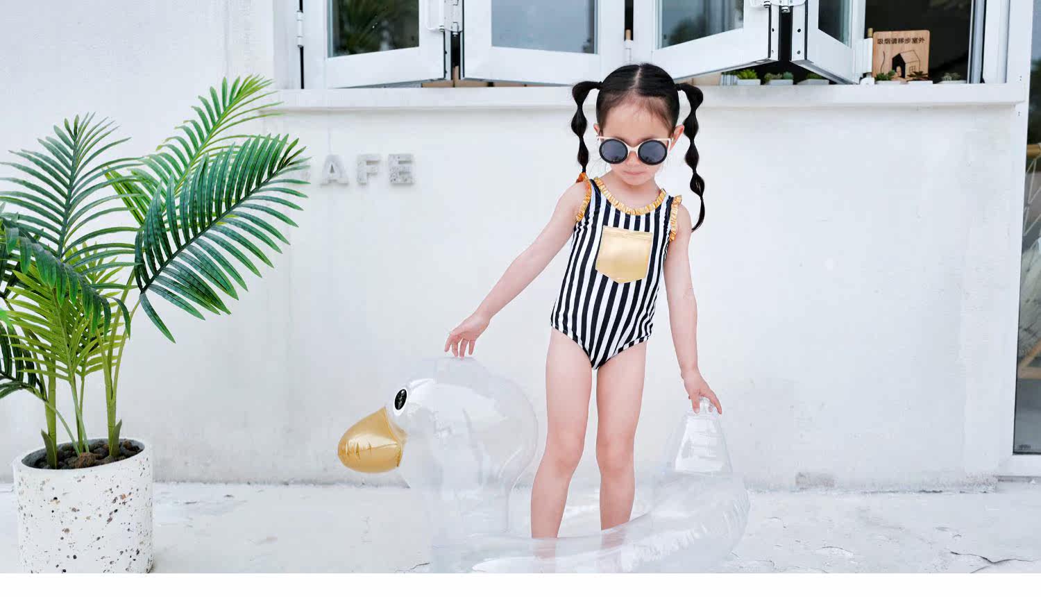 Enyakidz 19ss Эксклюзивный индивидуальный ребенок -ребенок черно -белый вертикальный полосатый золотой карман декоративный купальник