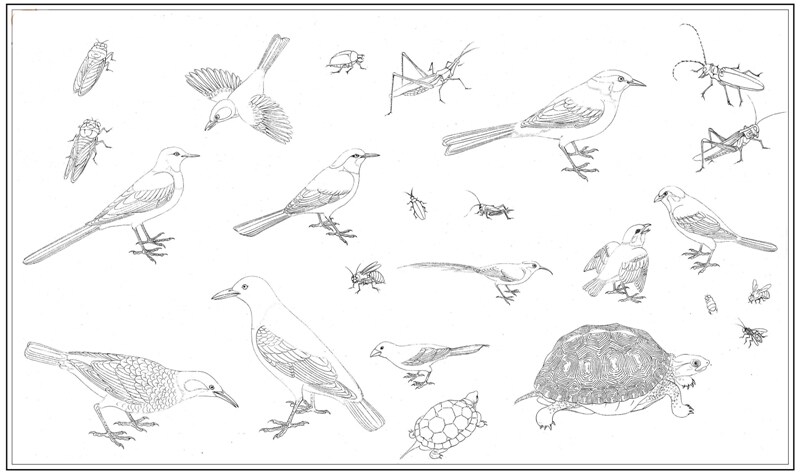 24 маленьких животных на картинке распределены равномерно, и между ними нет никакой связи.В левом нижнем углу рамы есть линия маленьких символов:“FU Ziju Baoxi”Из этого мы можем видеть, что этот «набросок редких птиц» - это просто материал, собранный автором для творения, и его передали его сыну Хуан Джубао для копирования и практики.