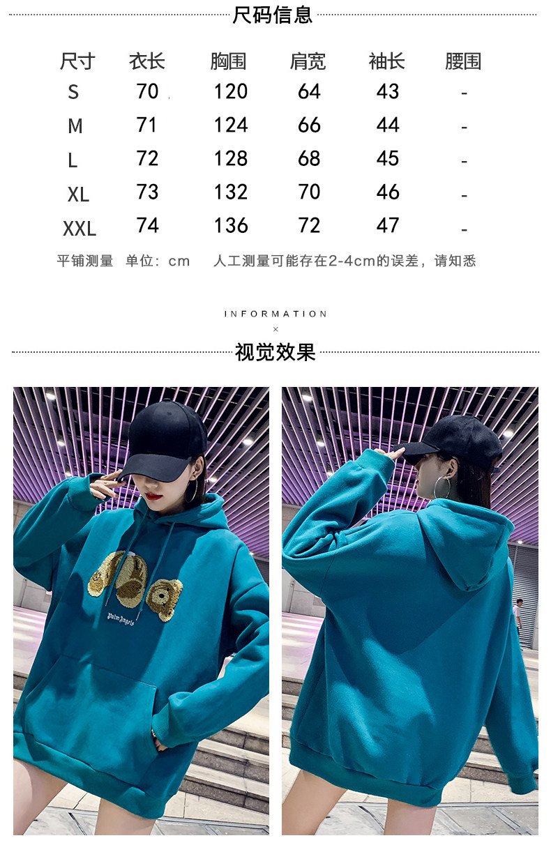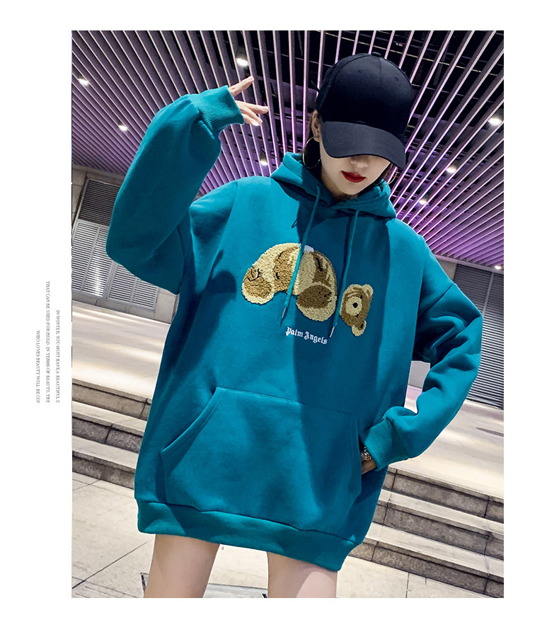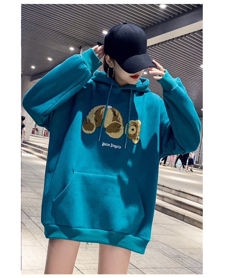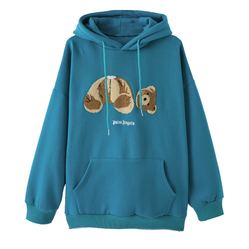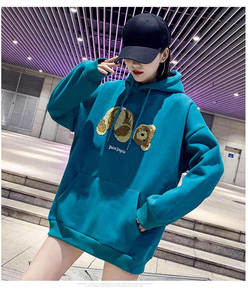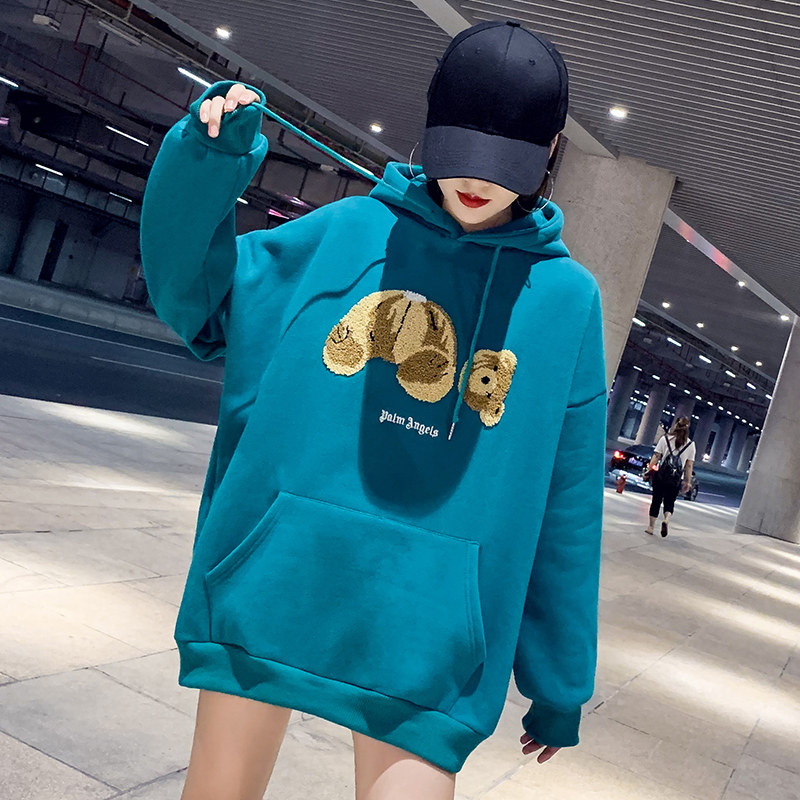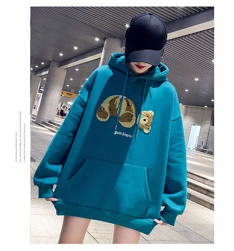 Синяя цветная длинная демисезонная флисовая дизайнерская толстовка с капюшоном с капюшоном, с медвежатами, увеличенная толщина, в корейском стиле, тренд сезона, средней длины, большой размер