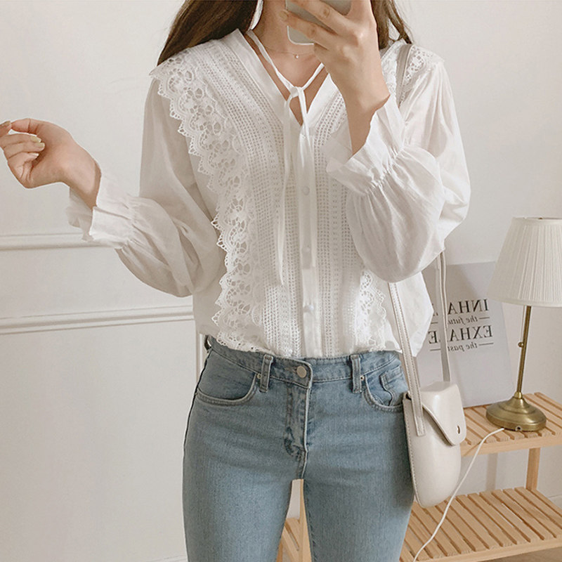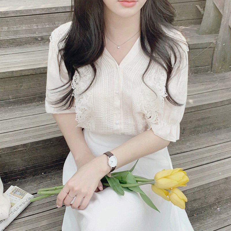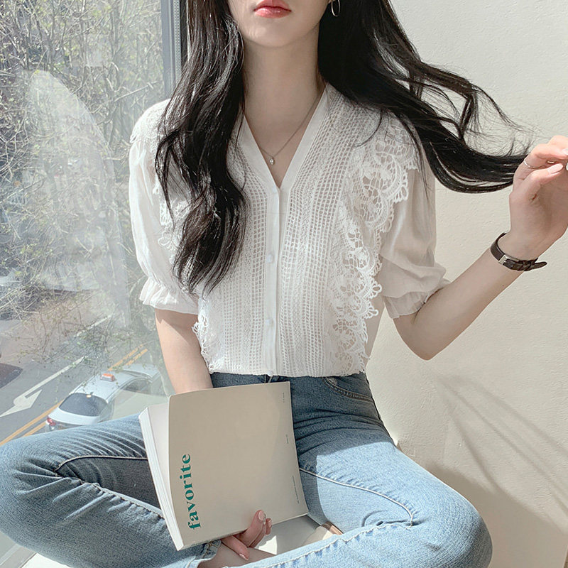 Сексуальная рубашка, кружевная футболка, в корейском стиле, оверсайз, кружевное платье, V-образный вырез, французский стиль, короткий рукав