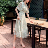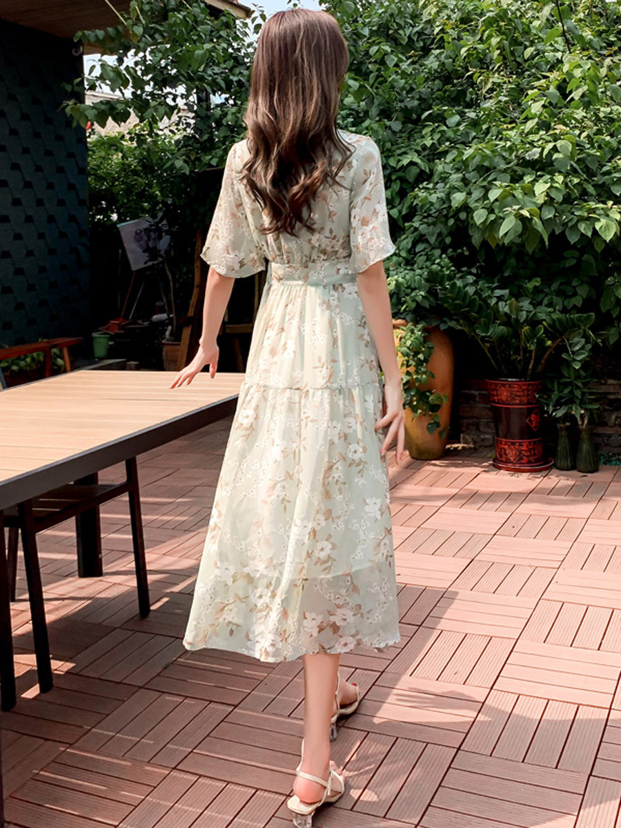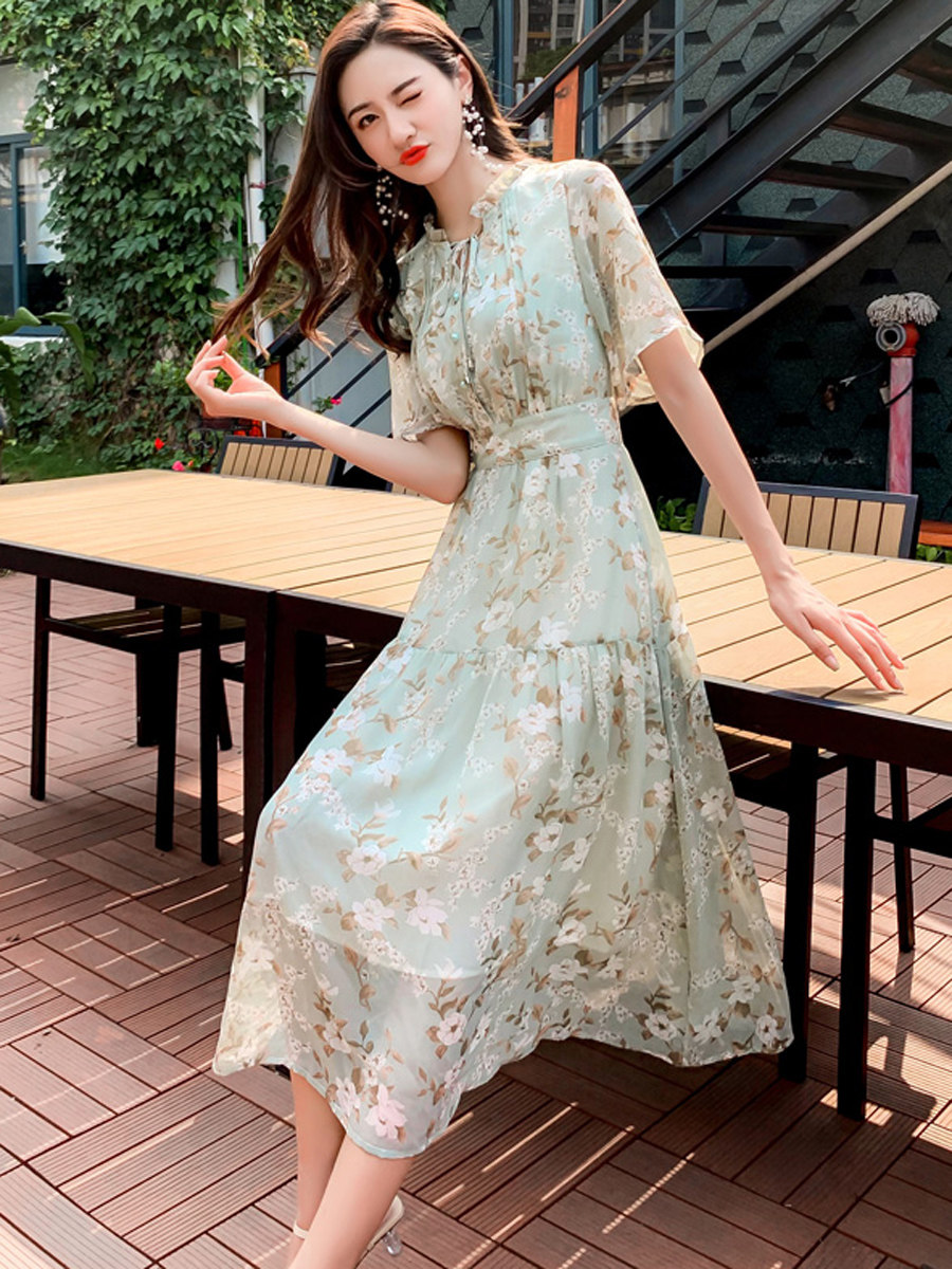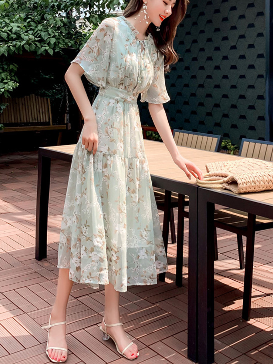Зеленое шифоновое летнее свежее платье, длинная юбка, средней длины, городской стиль