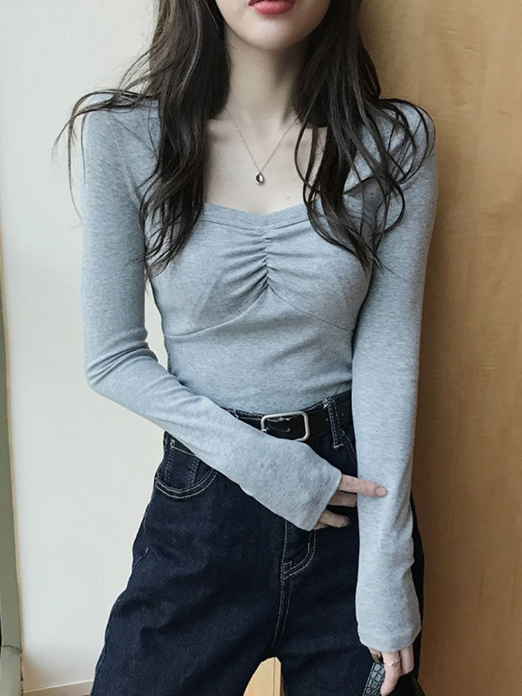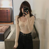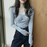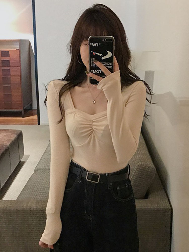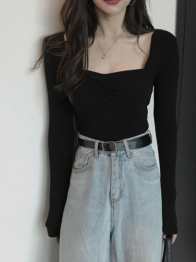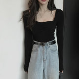 Осенний приталенный базовый приятный телу лонгслив, французский стиль, квадратный вырез, в западном стиле