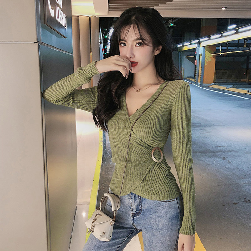 Базовый приятный телу демисезонный модный лонгслив, черный трикотажный свитер, 2020, V-образный вырез, с рукавом, в западном стиле