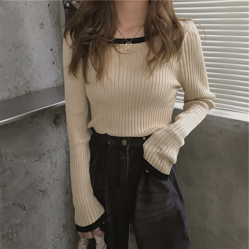 Весенний приталенный лонгслив с круглым воротником, базовый приятный телу свитер, в корейском стиле