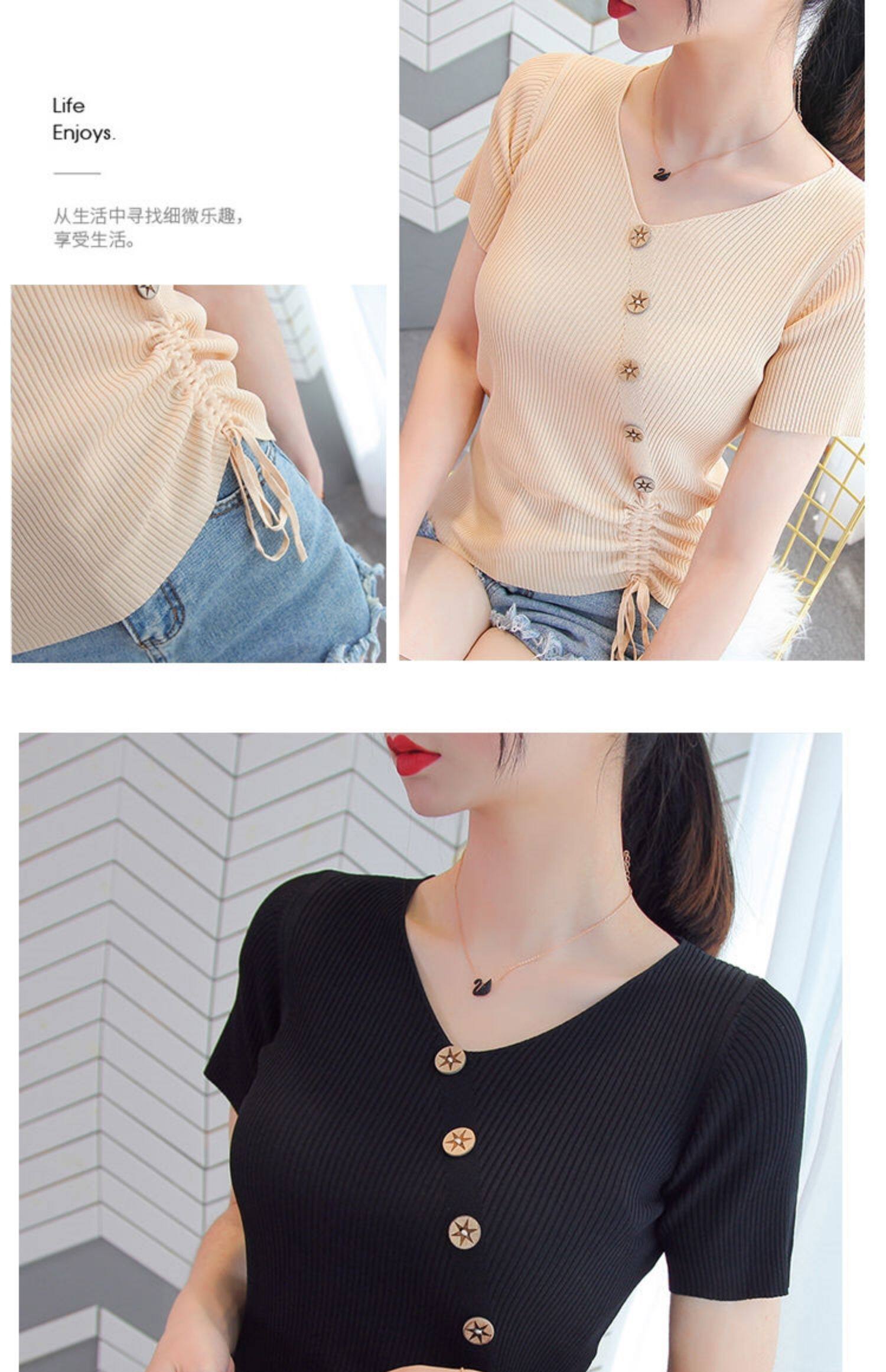 Шелковая летняя трикотажная футболка с коротким рукавом, V-образный вырез, на шнурках, на пуговицах