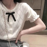 Шелковый тонкий трикотажный дизайнерский короткий свитер, в стиле Шанель, короткий рукав, 2024 года, «Холодное сердце», тренд сезона, французский стиль