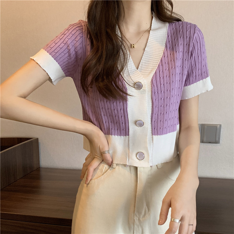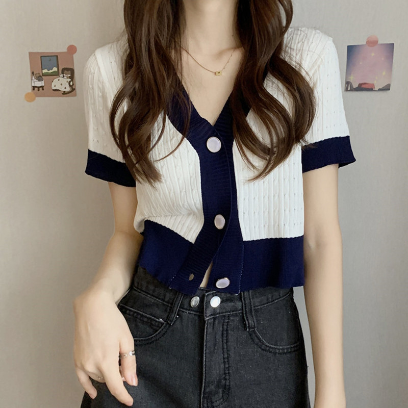Летний трикотажный короткий кардиган, футболка, V-образный вырез, популярно в интернете, короткий рукав