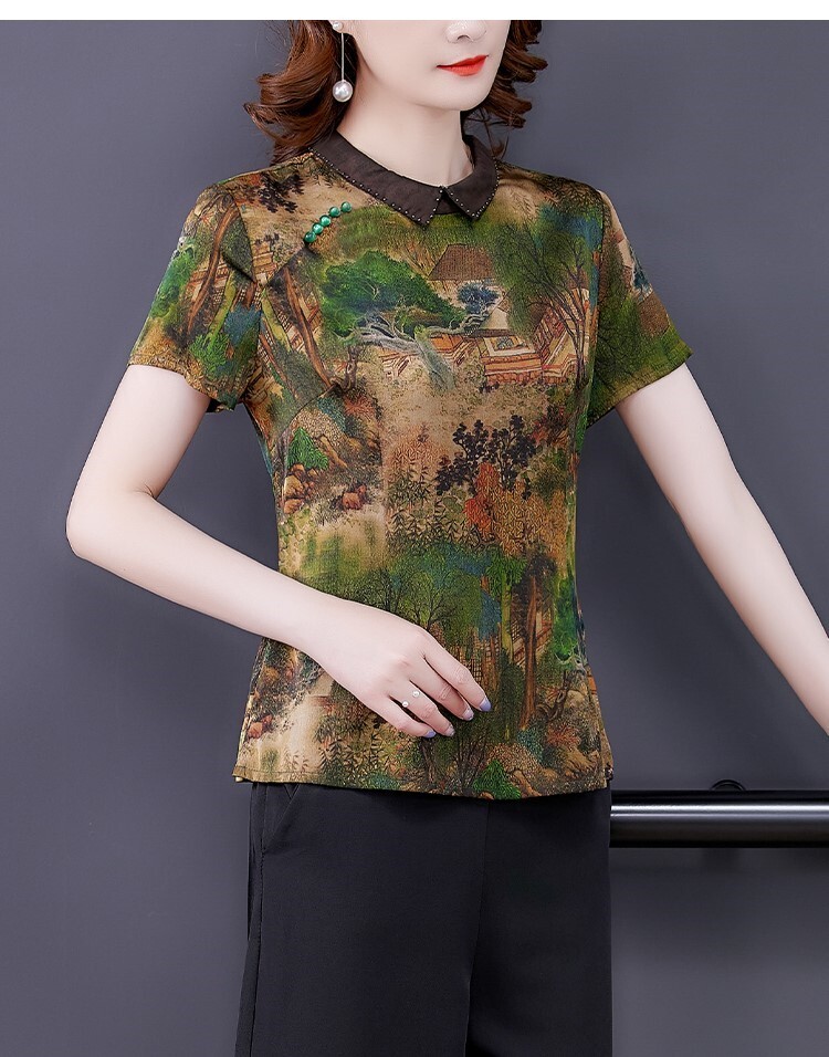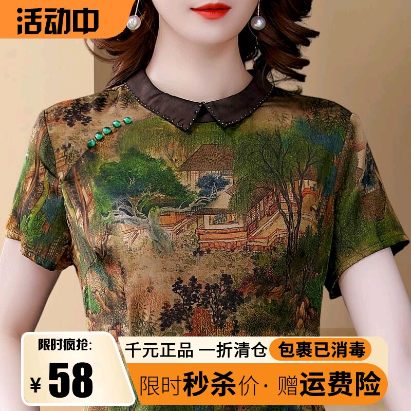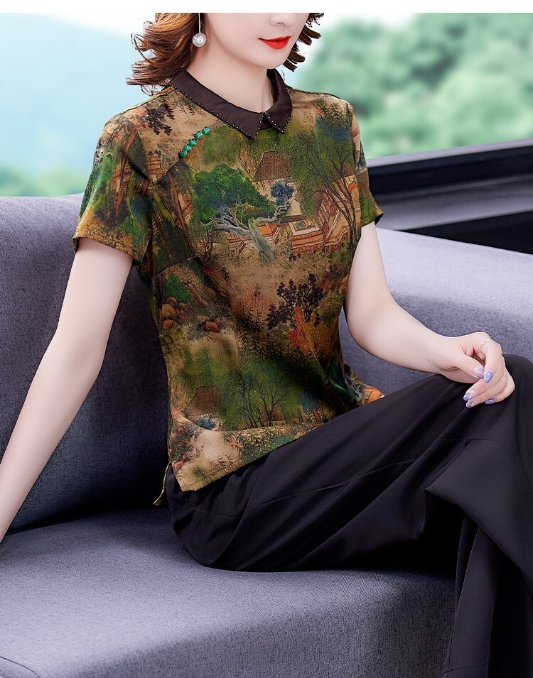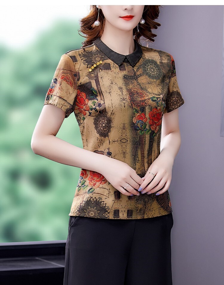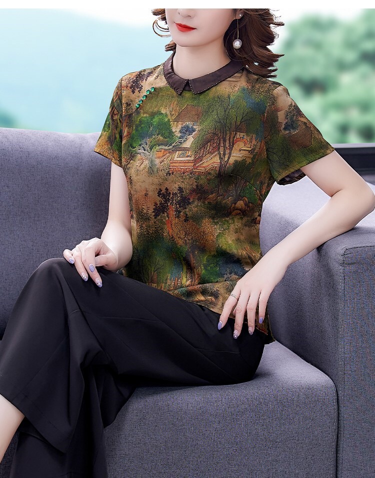 Тонкая шифоновая шелковая демисезонная базовая приятная телу футболка для матери, для среднего возраста, короткий рукав