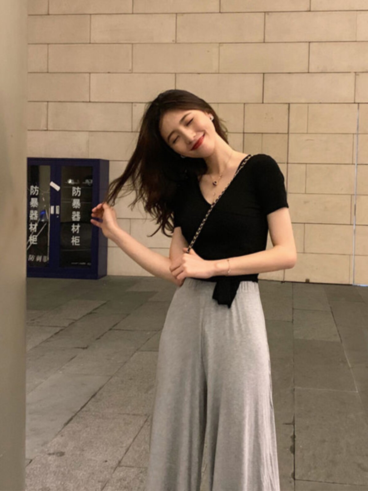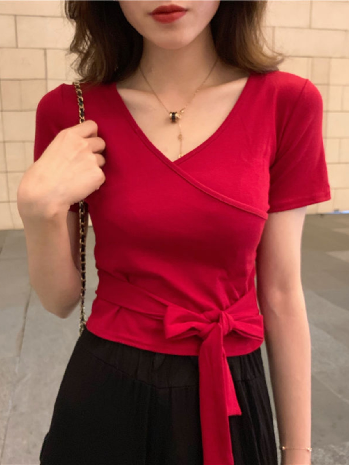 Сексуальный короткий ремень, летняя футболка с коротким рукавом, V-образный вырез, по фигуре, в корейском стиле