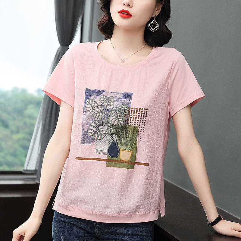 Хлопковая короткая T -Покененная женщина 2023 Летняя новая средняя мама помещает распущенную рубашку с печатной рубашкой с большим размером