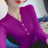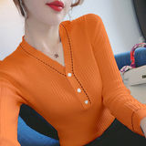 Лонгслив, трикотажный осенний свитер, осенняя базовая футболка, V-образный вырез, свободный крой