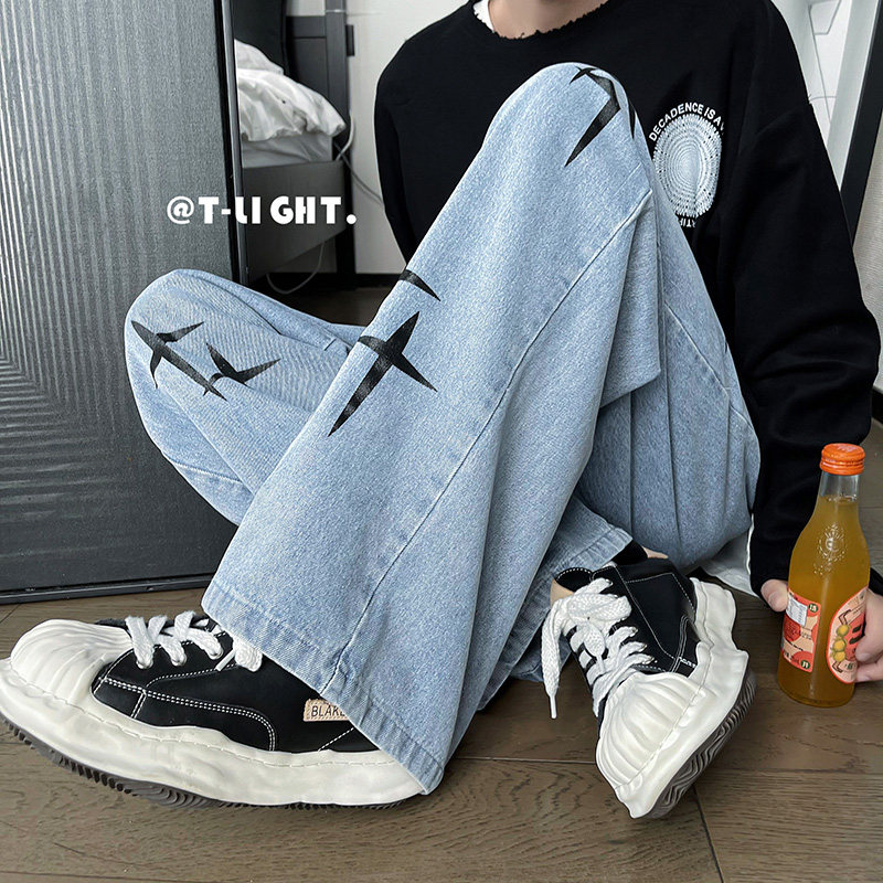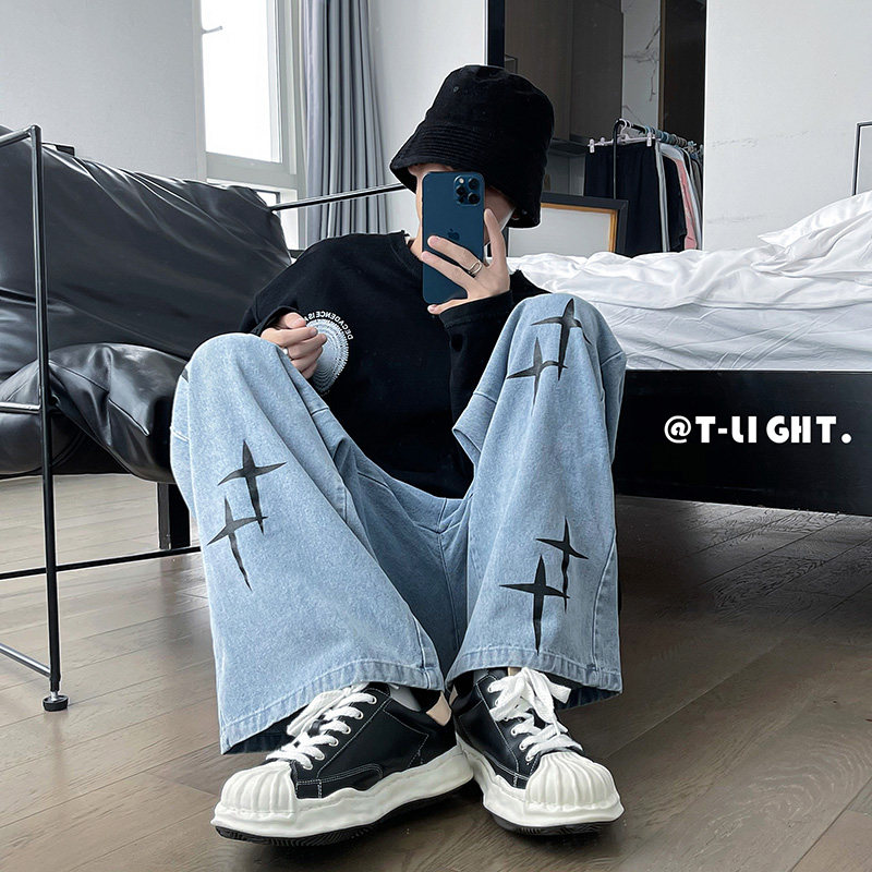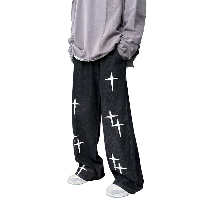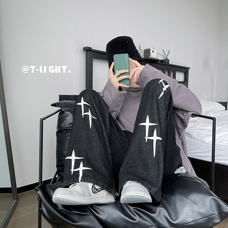 Винтажные американские ретро -джинсы Уличная вода для мытья воды, старые брюки мужской кросс -полки напечатанные уличные брюки