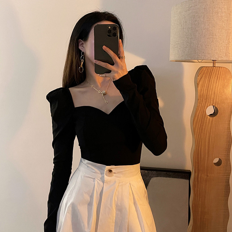 Осенний сексуальный короткий базовый приятный телу лонгслив, рукава фонарики, квадратный вырез, коллекция 2022