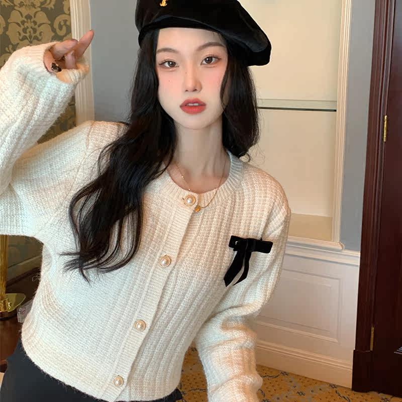 Короткий демисезонный дизайнерский кардиган с бантиком, в стиле Шанель, в западном стиле, тренд сезона, высокая талия