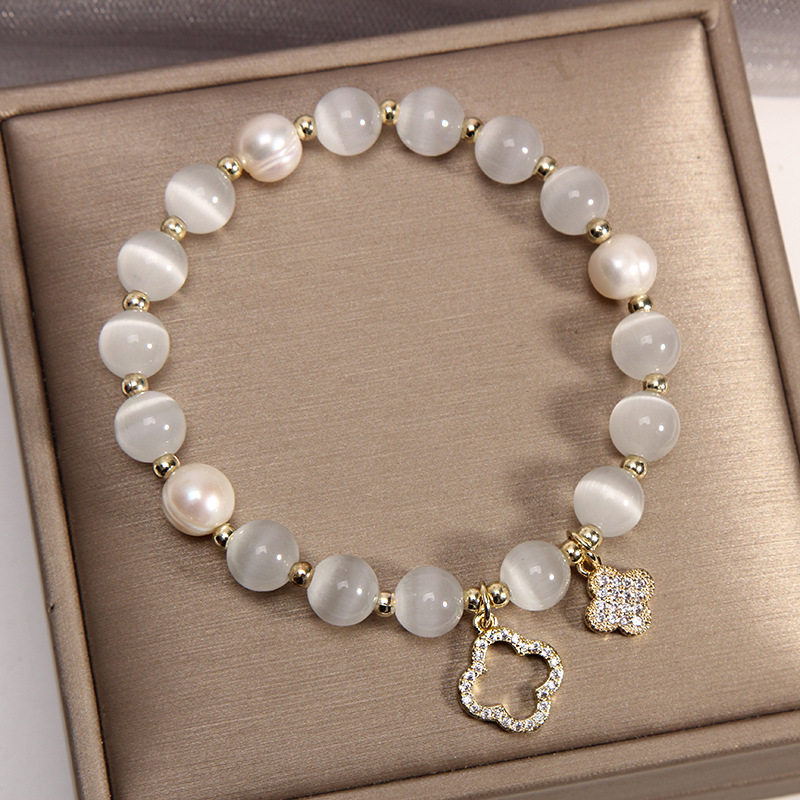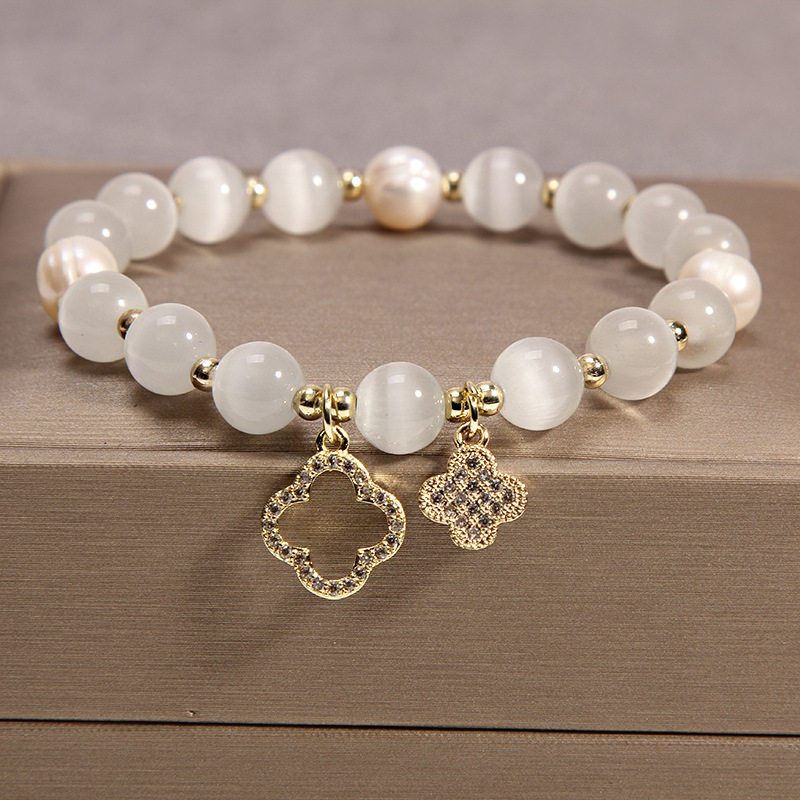 Браслет из жемчуга, ретро небольшой дизайнерский аксессуар с цирконом, кошачий глаз, четырехлистный клевер, микроинкрустация