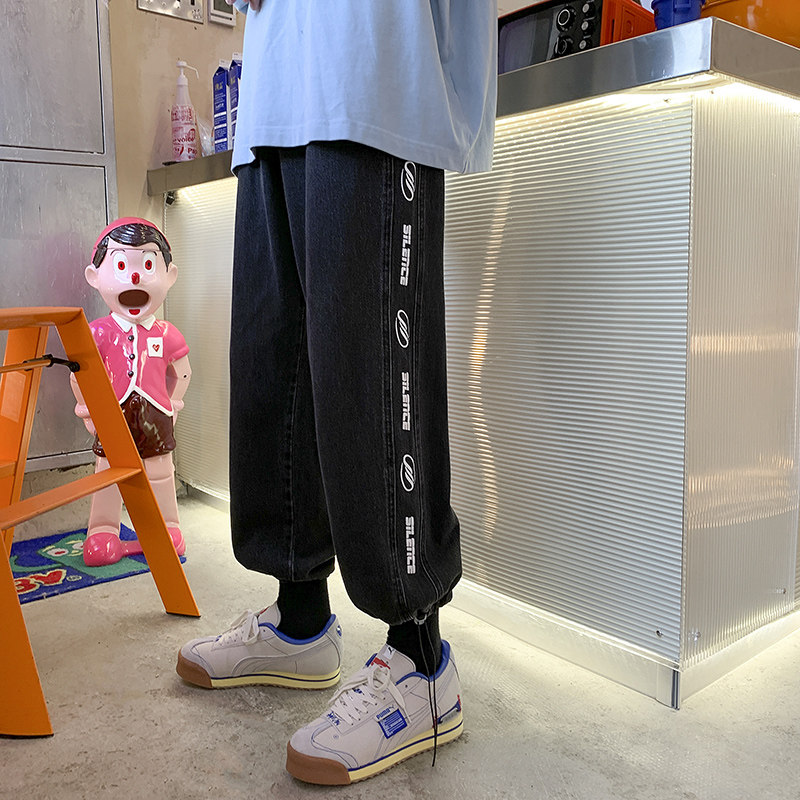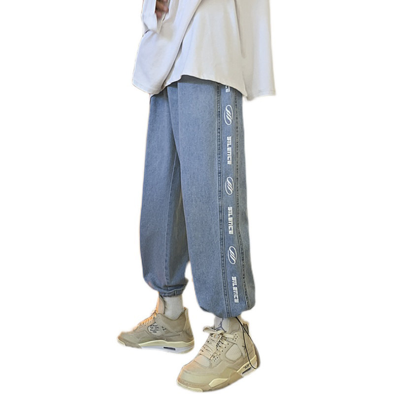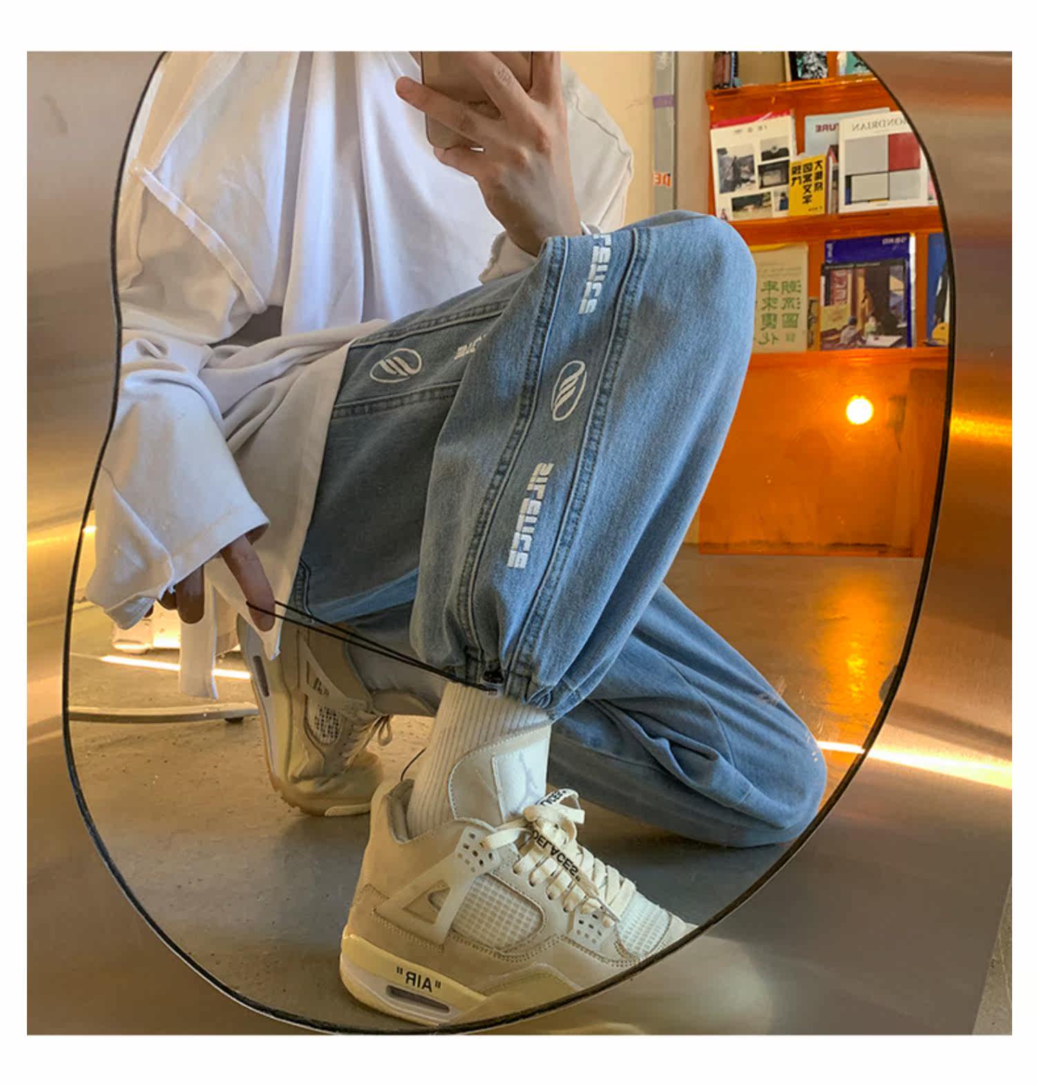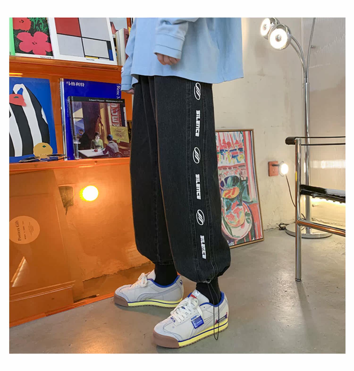 Чистая ピュ ア Печать сплайсинга джинсовой джинсы мужские брюки Нейтральный ветер -линии все -матч универсальные брюки для ног висят ощущение