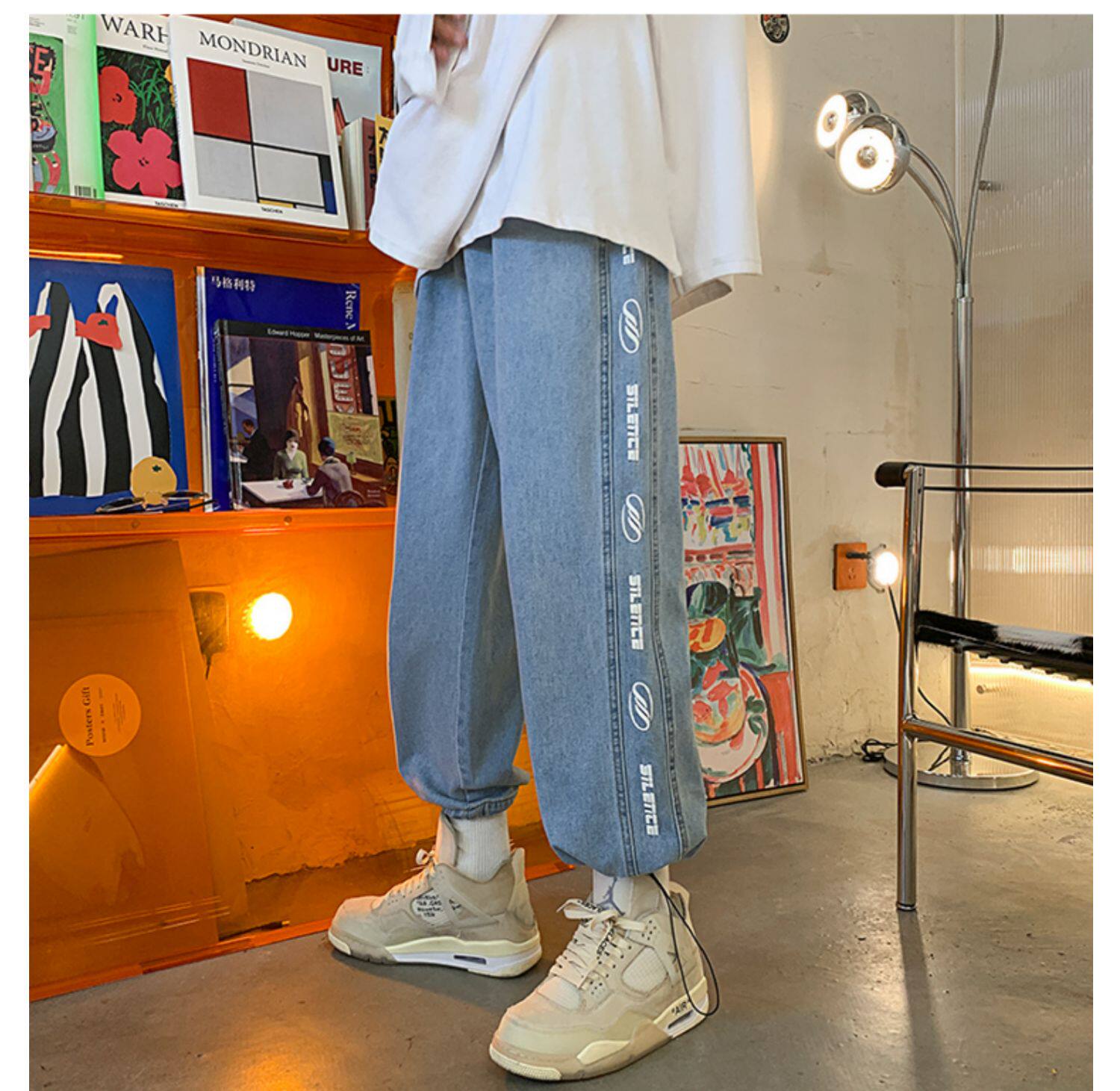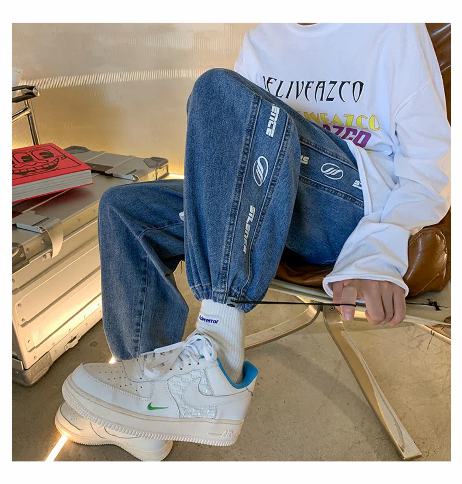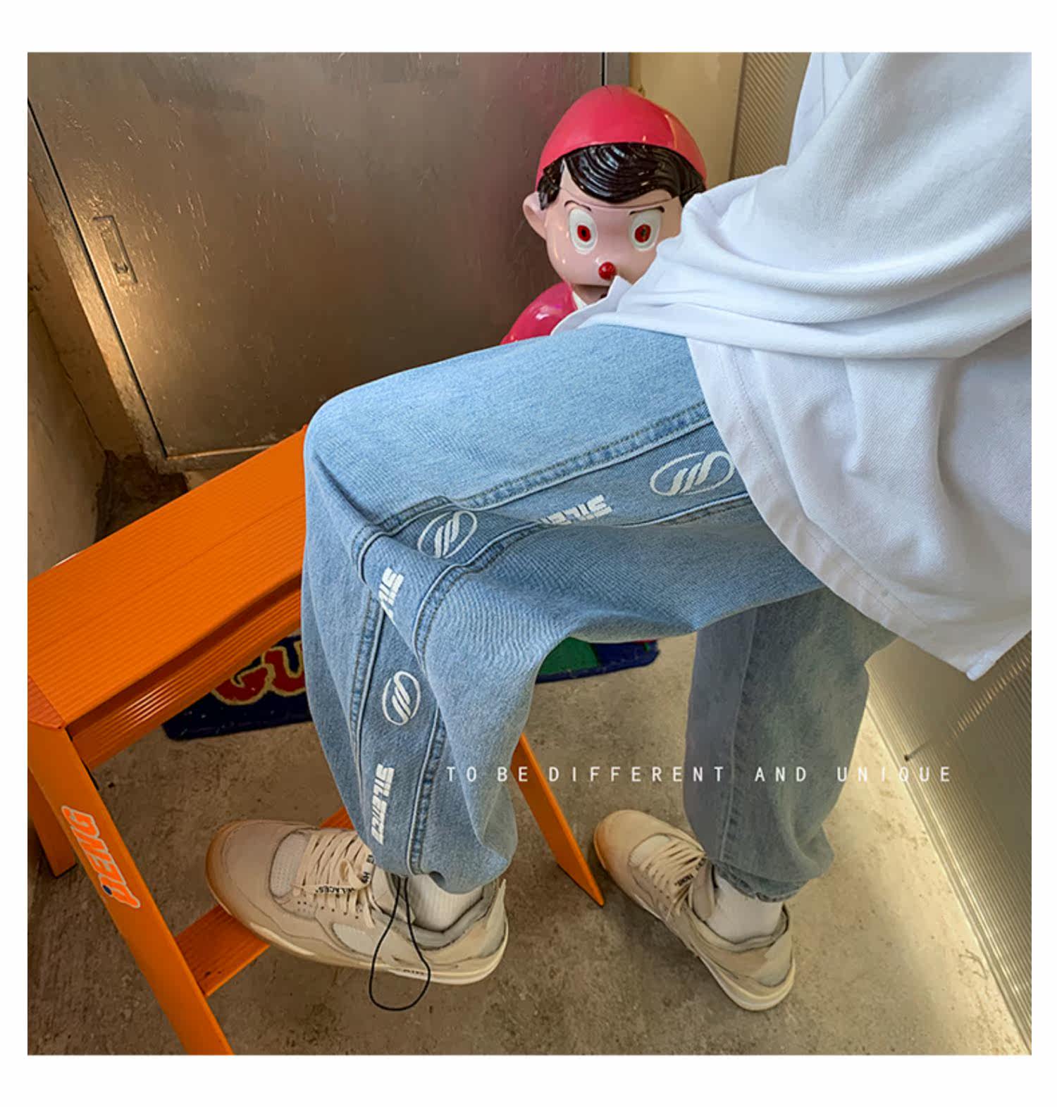 Чистая ピュ ア Печать сплайсинга джинсовой джинсы мужские брюки Нейтральный ветер -линии все -матч универсальные брюки для ног висят ощущение